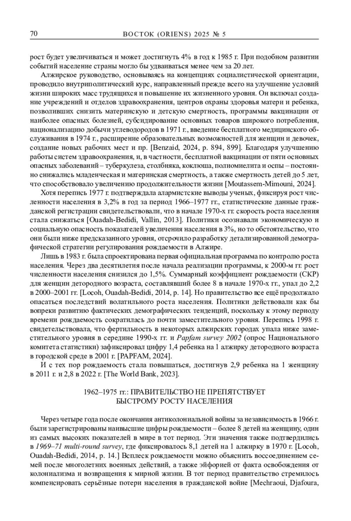 18. Ouadah-Bedidi Z., Vallin J. Fertility and Population Policy in Algeria: Discrepancies between Planning and Outcomes. Population and Development Review. 2013. Vol. 38. Pp. 179-196.