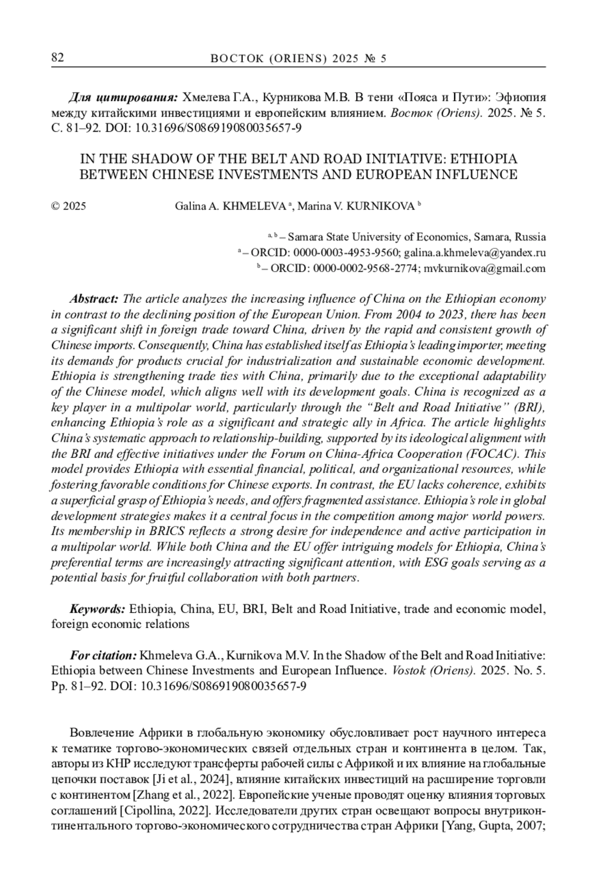 В статье анализируется растущее влияние Китая на экономику Эфиопии, что связано с ослаблением позиций Европейского Союза. Это проявляется по многим параметрам. С 2004 по 2023 гг. заметно смещение фокуса внешней торговли в сторону КНР за счет устойчиво опережающего роста импорта последней. В результате КНР прочно закрепилась в качестве ведущего импортера, покрывая потребности Эфиопии в продукции для индустриализации и развития экономики в целом. Эфиопия активно укрепляет торговые связи с КНР прежде всего, благодаря гибкости китайской модели, ее соответствию интересам развития. КНР воспринимается как авторитетный лидер многополярного мира, где ведущая роль отведена инициативе «Один пояс – один путь», что оказывает влияние на Эфиопию как важного союзника КНР в Африке. Статья подчеркивает системный подход Китая к построению взаимоотношений, подкрепленный идеологической близостью ОПОП и эффективной реализацией решений в рамках Форума китайско-африканского сотрудничества. Модель Китая предоставляет Эфиопии финансовые, политические и организационные ресурсы для достижения стратегических целей, хотя и создает благоприятные условия для китайского экспорта и обеспечивает политическую лояльность. Напротив, Евросоюз демонстрирует отсутствие системности, поверхностное понимание потребностей Эфиопии и фрагментарную помощь. Показано, что Эфиопия является важным партнером в глобальных стратегиях развития и сотрудничества, что делает ее объектом интенсивной конкуренции между ведущими странами мира. Вступление Эфиопии в БРИКС показывает стремление Эфиопии к независимости и активному участию в формирующемся многополярном мире. Обе модели, ЕС и КНР, признаются интересными для Эфиопии, но в свете предоставления Китаем преференций, аналогичных европейским, акцент смещается в сторону азиатского партнера. В заключение отмечен потенциал ESG-целей как объединяющей основы для сотрудничества Эфиопии с обеими сторонами, что может способствовать устойчивому развитию и будущему росту торговых потоков.
