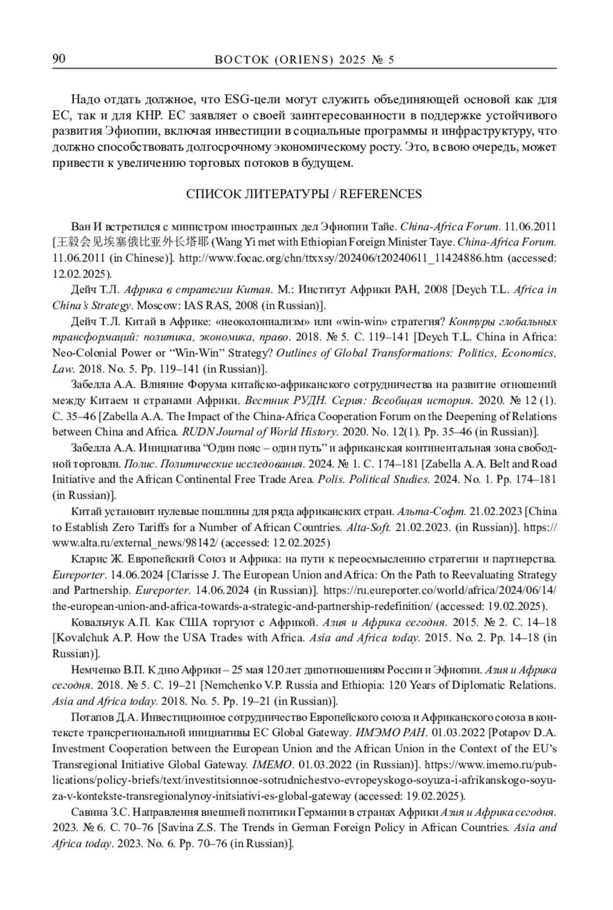 4. Забелла А.А. Влияние Форума китайско-африканского сотрудничества на развитие отношений между Китаем и странами Африки. Вестник РУДН. Серия: Всеобщая история. 2020. № 12(1). С. 35-46.