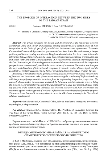 В статье рассматривается развитие взаимоотношений между материковым Китаем и Тайванем и созданные условия для определенной степени интегрированности на основе учрежденных с этой целью специальных институтов и достигнутых договоренностей: подписания Рамочного соглашения об экономическом сотрудничестве 2010 г. (ECFA) и практического взаимодействия на разных уровнях – правительственных и местных. Отмечаются принципиальные политические позиции, придерживаясь которых гоминьдановская администрация Ма Инцзю готова была выстраивать межбереговое взаимодействие. Это отказ от официального провозглашения независимости Тайваня, равно как и отказ от воссоединения с материком, несмотря на бескомпромиссную принципиальную позицию КПК, заключающуюся в безусловном признании Тайваня неотъемлемой частью территории КНР. Были продемонстрированы и отработаны потенциальные возможности развития многосторонних связей на практике с перспективой на интеграцию, и обеими сторонами наработан соответствующий опыт в условиях сохранения статус-кво в Тайваньском проливе. Исследуются пути и направления развития взаимоотношений (экономических, правовых и социокультурных) и возможность углубления всесторонних контактов в обстановке разногласий двух Берегов, в том числе весьма острых внутриполитических на Тайване. Освещаются вопросы взаимной торговли, инвестиций, туризма, предоставления медицинских услуг, развития сотрудничества в сфере транспорта и т. д. Учитывая складывающуюся кризисную ситуацию в глобальной экономике, представилось необходимым затронуть вопросы финансово-инвестиционных рисков взаимодействия и состояния принципиально важной для обеих сторон высокотехнологичной индустрии с точки зрения перспективы инженерной интеграции «разделенной китайской нации». Рассматриваются меры тайваньской администрации по выводу глобальной конкурентоспособности тайваньской индустрии на качественно новый уровень. Также анализируются взаимоотношения в ключевом вопросе совместного и каждого в отдельности пользования морскими ресурсами и сохранения биоразнообразия океана на фоне создающейся с этими целями инфраструктуры Тайваньского пролива (Пролива). Для полноты картины сопоставляются основные мотивы обеих сторон в развитии межбереговых отношений.