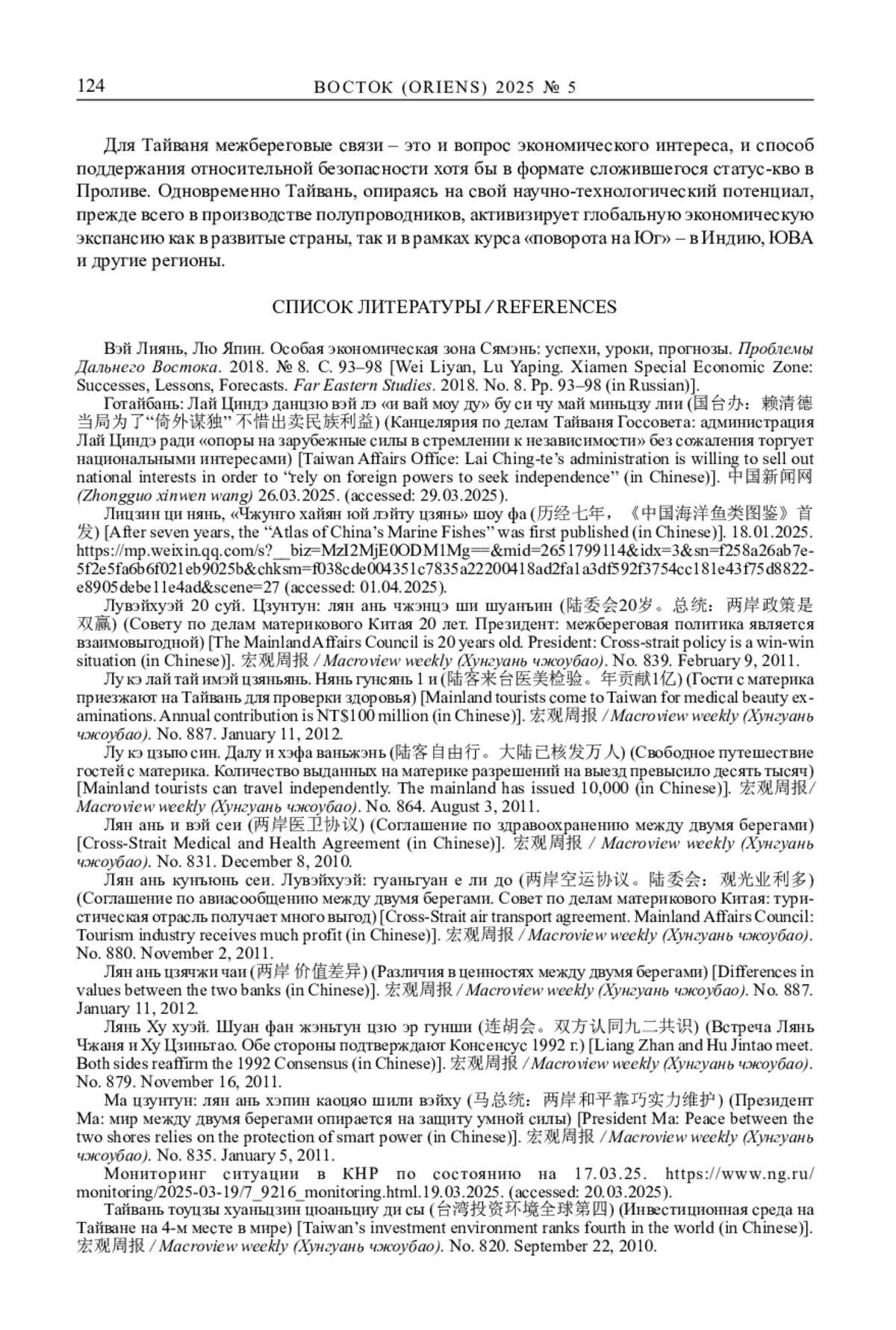 22. Шиэр’у гуйхуа. Лян ань гуаньси даньду чэнчжан (十二五规划。两岸关系单独成章) (План на 12 пятилетку. Отдельное видение каждой из сторон Пролива отношений двух берегов). 宏观周报 / Macroview weekly (Хунгуань чжоубао). No. 843. March 9, 2011 (на китайском языке).