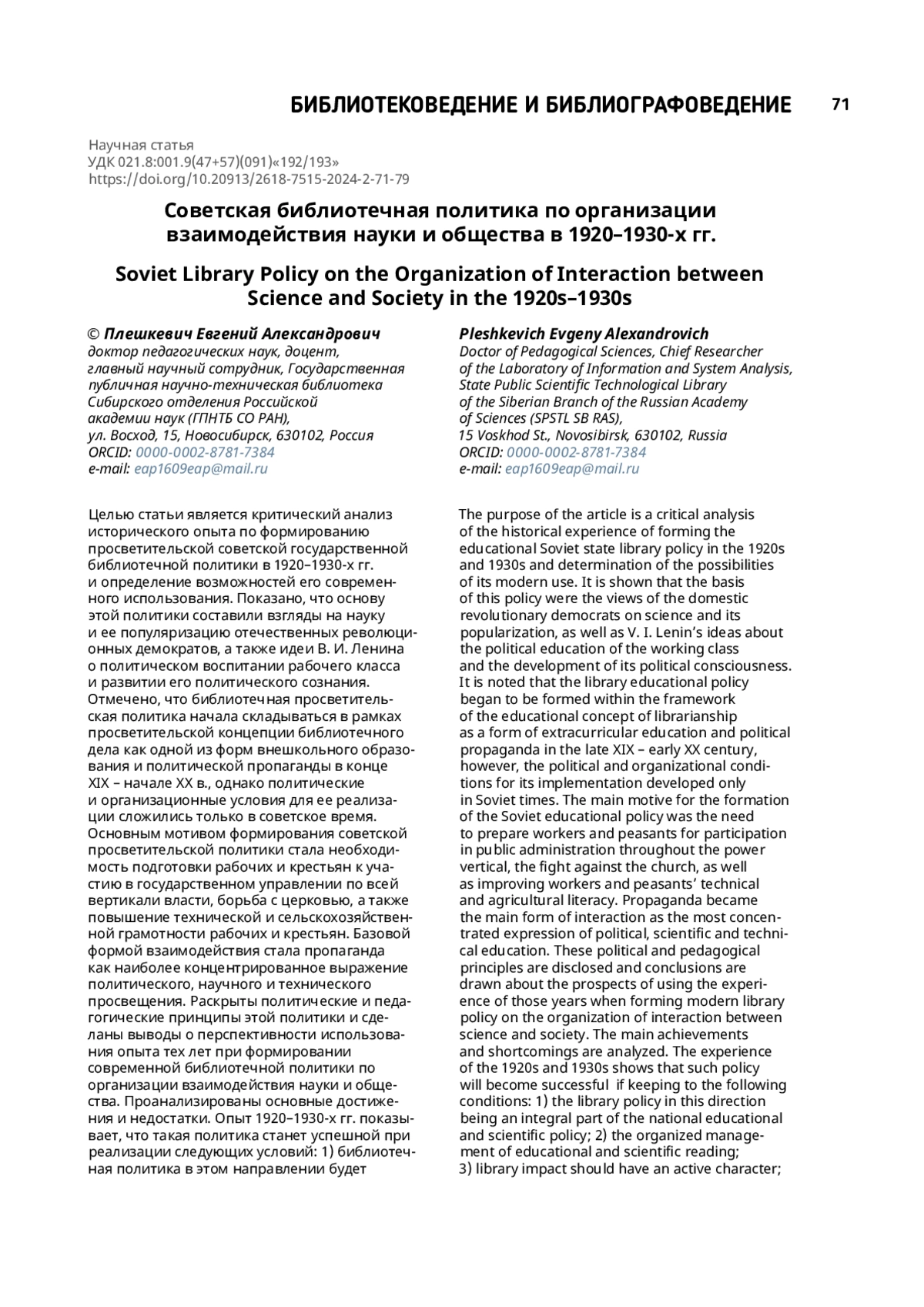 Целью статьи является критический анализ исторического опыта по формированию просветительской советской государственной библиотечной политики в 1920–1930‑х гг. и определение возможностей его современного использования. Показано, что основу этой политики составили взгляды на науку и ее популяризацию отечественных революционных демократов, а также идеи В. И. Ленина о политическом воспитании рабочего класса и развитии его политического сознания. Отмечено, что библиотечная просветительская политика начала складываться в рамках просветительской концепции библиотечного дела как одной из форм внешкольного образования и политической пропаганды в конце XIX – начале XX в., однако политические и организационные условия для ее реализации сложились только в советское время. Основным мотивом формирования советской просветительской политики стала необходимость подготовки рабочих и крестьян к участию в государственном управлении по всей вертикали власти, борьба с церковью, а также повышение технической и сельскохозяйственной грамотности рабочих и крестьян. Базовой формой взаимодействия стала пропаганда как наиболее концентрированное выражение политического, научного и технического просвещения. Раскрыты политические и педагогические принципы этой политики и сделаны выводы о перспективности использования опыта тех лет при формировании современной библиотечной политики по организации взаимодействия науки и общества. Проанализированы основные достижения и недостатки. Опыт 1920–1930-х гг. показывает, что такая политика станет успешной при реализации следующих условий: 1) библиотечная политика в этом направлении будет составной частью общегосударственной просветительской и научной политики; 2) будет организовано управление просветительским и научным чтением; 3) библиотечное воздействие должно носить активный характер; 4) принципы современной просветительской библиотечной политики модернизируются с учетом достижений педагогической науки в области просветительства, социологии чтения, информационной культуры и популяризации науки.