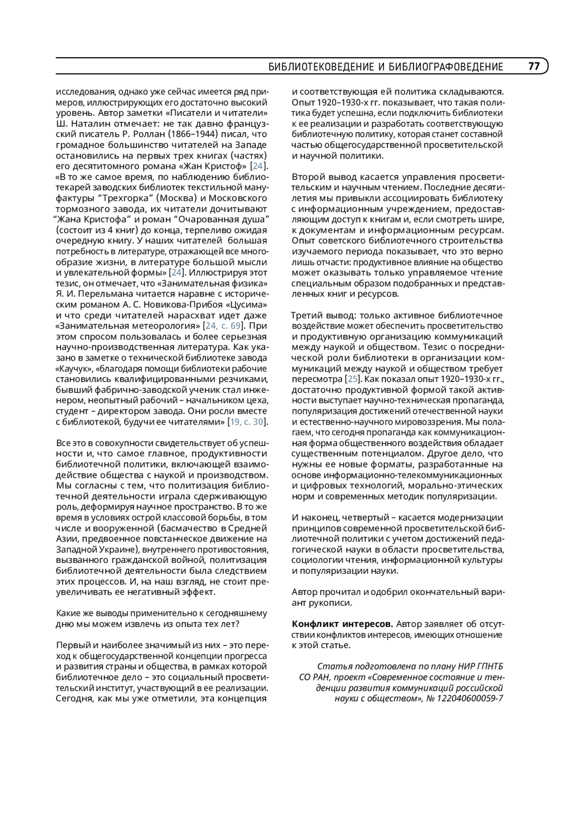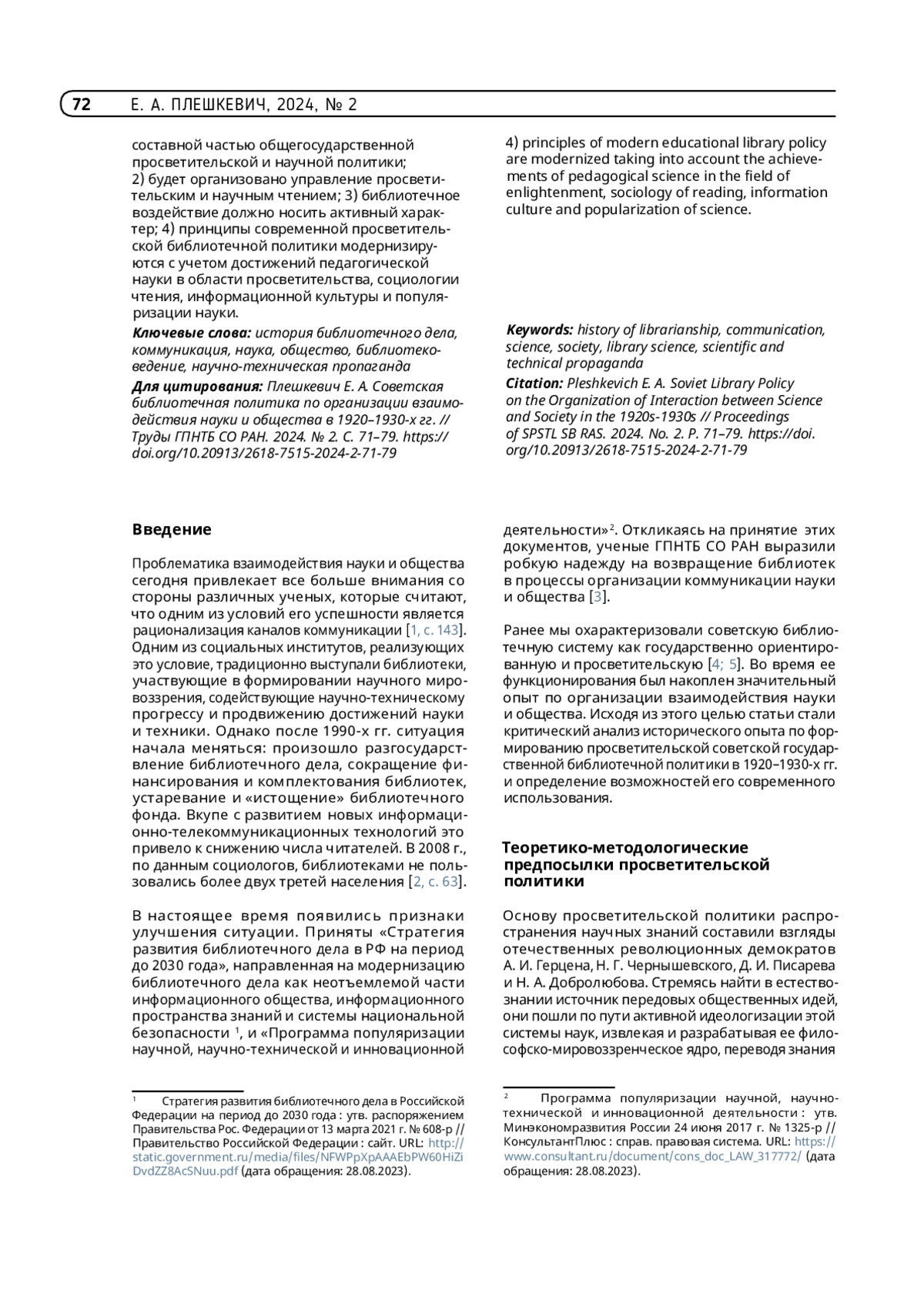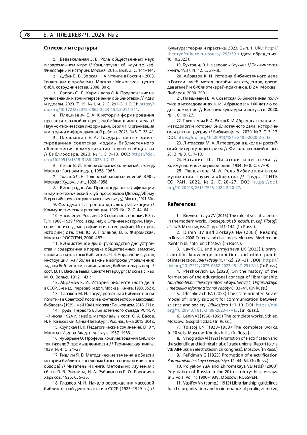 5. Плешкевич Е. А. Государственно ориентированная советская модель библиотечного обеспечения коммуникации науки и общества // Библиосфера. 2023. № 1. С. 7-13. https://doi.org/10.20913/1815-3186-2023-1-7-13.
