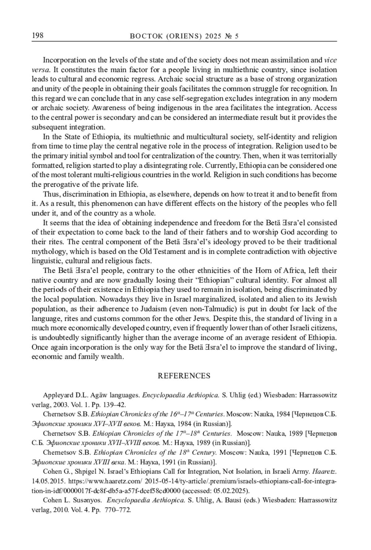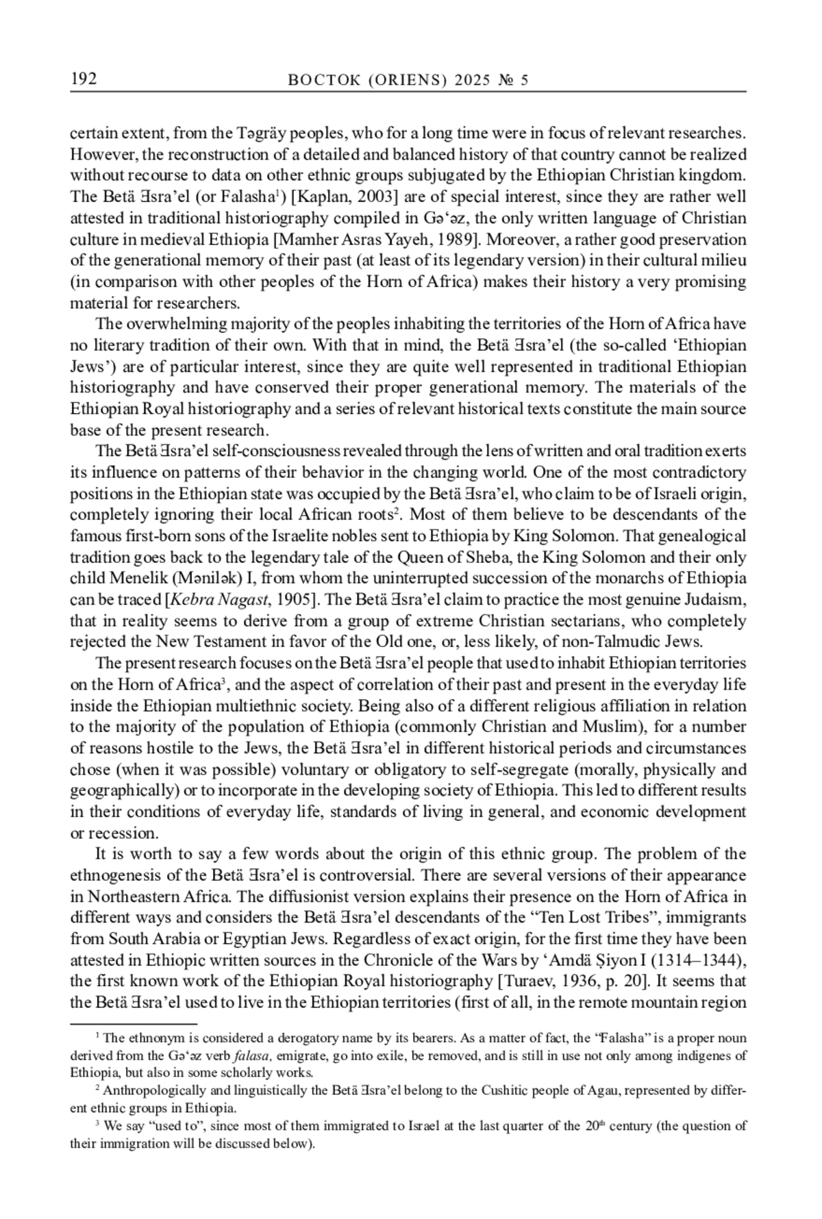 Ethiopia is one of the most ethnically heterogeneous countries of the African continent. The overwhelming majority of its peoples have no literary tradition of their own. As a result, their lifestyle, manners and customs can be examined through field researches with only few exceptions. In this connection the Amhara and the Təgräy ethnic groups, who traditionally constitute the ruling class of the Christian state of Ethiopia, and at least one more people, viz. the Betä Ǝsra’el (the so-called ‘Ethiopian Jews’, or Falasha), are of particular interest, since all of them are more or less well represented in traditional Ethiopian historiography and have more or less well conserved their proper generational memory. The self-consciousness of the Betä Ǝsra’el revealed through the lens of written and oral tradition exerts its influence on patterns of their behavior in the changing world. Archaic backgrounds of their existence, especially their origin myths, were often left on the surface throughout different recorded periods of their existence and they remained aliens in Ethiopian society. The process of the alternate self-segregation and incorporation of the Betä Ǝsra’el within the Ethiopian state and the resulting social changes in the life of the people (both positive and negative) that occurred are demonstrated in the frame of the present research. The struggle for self-identity and recognition of the Betä Ǝsra’el as the descendants of King Solomon’s noblemen is still in progress, even in Israel where they managed to move almost entirely in the last quarter of the 20th century.