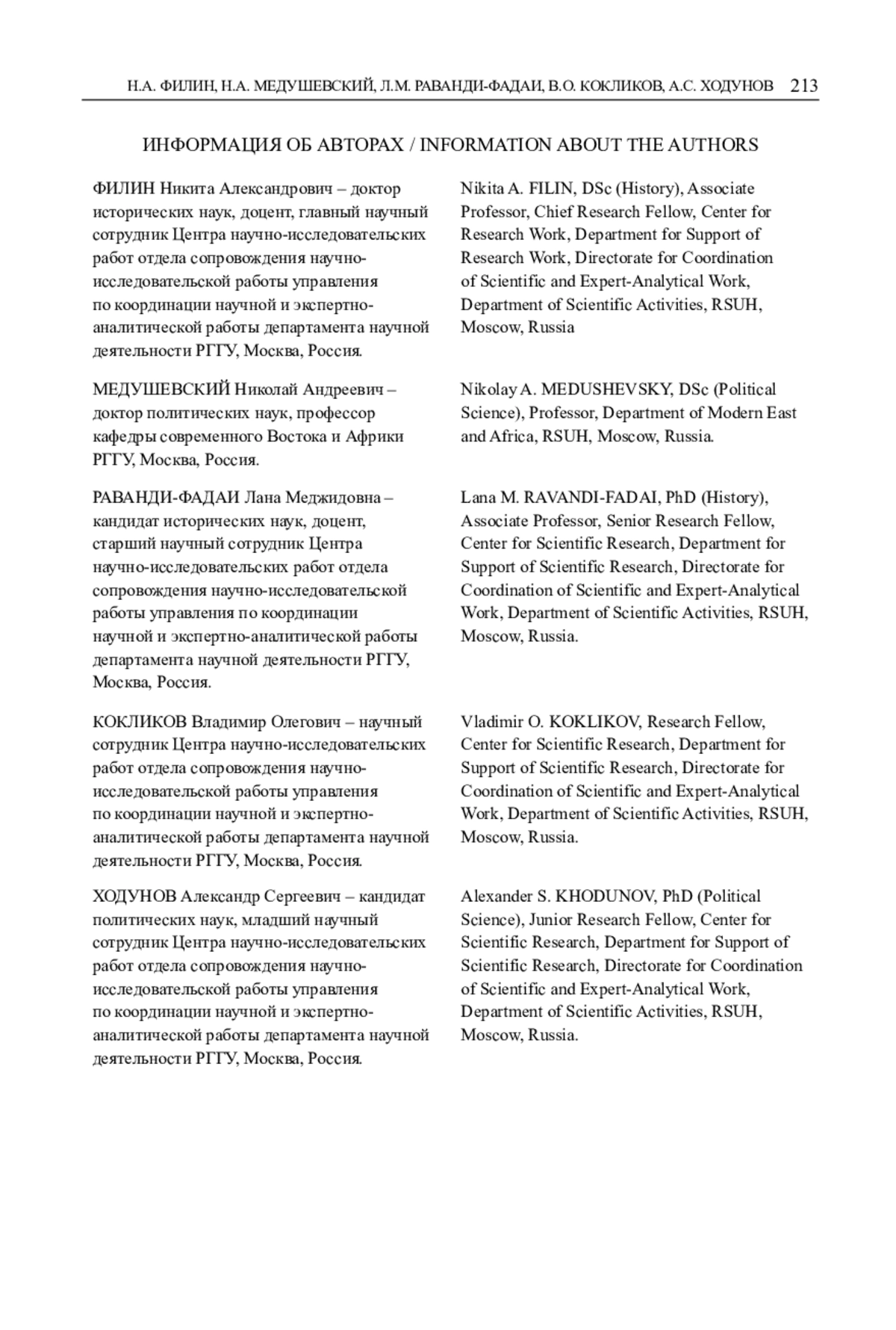 15. Филин Н. А., Кокликов В. О. Восприятие России в истории Ирана (по материалам иранских учебников истории). Россия и Иран: Пять веков сотрудничества: сб. материалов международной научной конференциu. Отв. ред. А. Б. Безбородов, В. В. Наумкин, А. К. Аликберов. М.: РГГУ, 2022. С. 191-200.