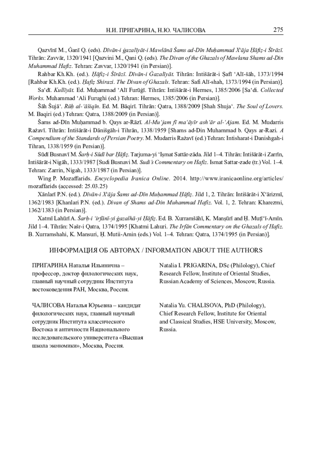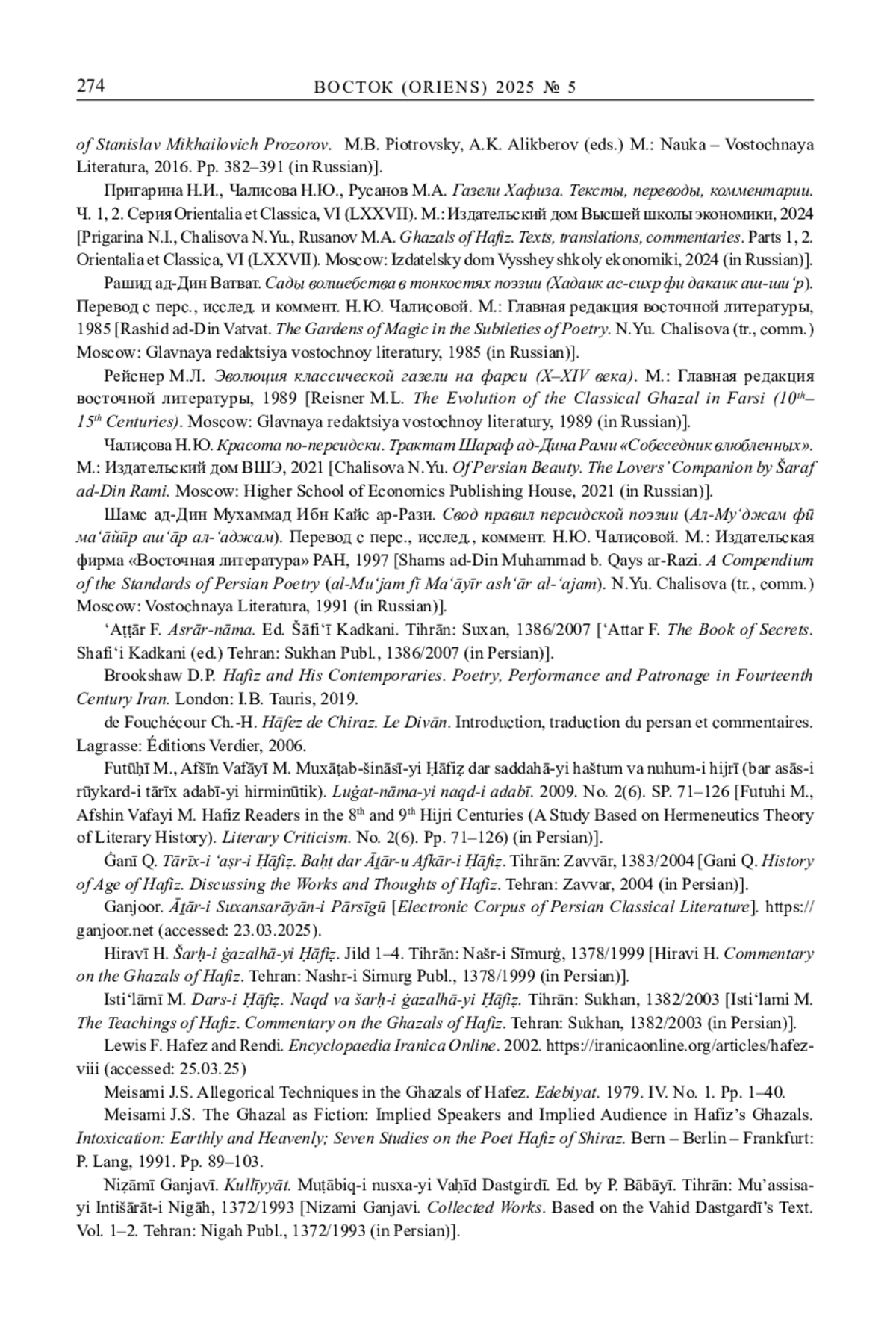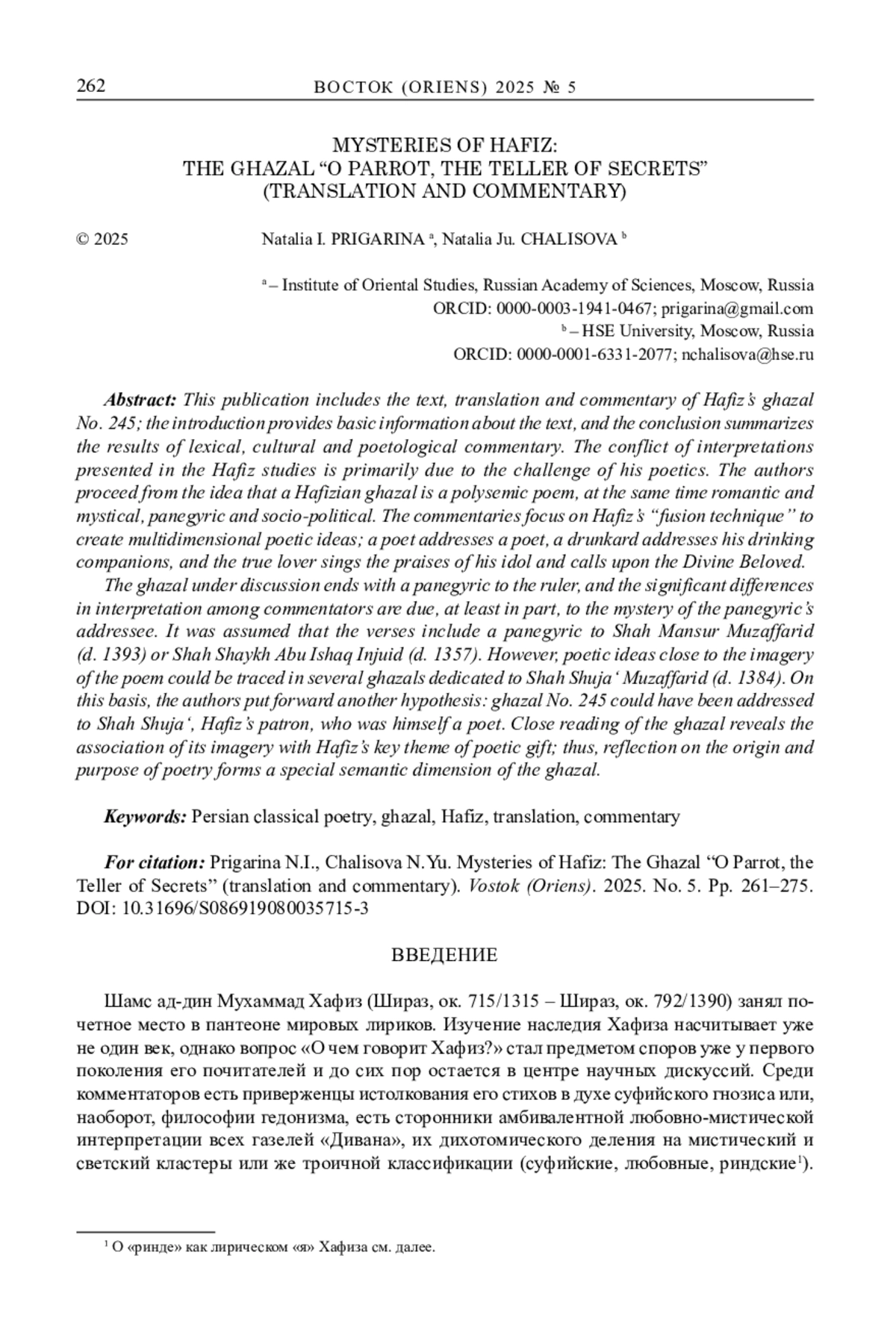 ПРИГАРИНА Н. И., ЧАЛИСОВА Н. Ю. ЗАГАДКИ ХАФИЗА: ГАЗЕЛЬ «О ПОПУГАЙ, ВЕЩАЮЩИЙ О ТАЙНАХ» (ПЕРЕВОД И КОММЕНТАРИЙ) // ВОСТОК. АФРО-АЗИАТСКИЕ ОБЩЕСТВА: ИСТОРИЯ И СОВРЕМЕННОСТЬ. 2025. № 5