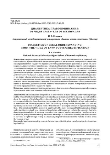 Актуализируется проблема воплощения типов правопонимания в правовой действительности. Правопонимание в качестве творческой деятельности по выработке теоретических представлений о сущности права полностью достигает своей цели лишь в случае объективации, т. е. приобретения «идеей права» внешней, объективной формы существования. Диалектика правопонимания раскрывается в следующей последовательности: от мыслительной деятельности по выработке понятия, выражающего сущность права, к его результату - созданию целостной концепции правопонимания, затем - воплощению данной концепции в правовой действительности. Сделан вывод, согласно которому диалектика правопонимания обнаруживает все новые объемы знания, что не исключает обратного, т. е. его (знания) деградации. Закономерны продуцирование новых типов правопонимания, трансформация или элиминация, наполнение их вновь открывшимися смыслами. В этом бесконечном обновлении объективация «идеи права» в правовой действительности является необходимым этапом верификации жизнеспособности представлений о сущности права.