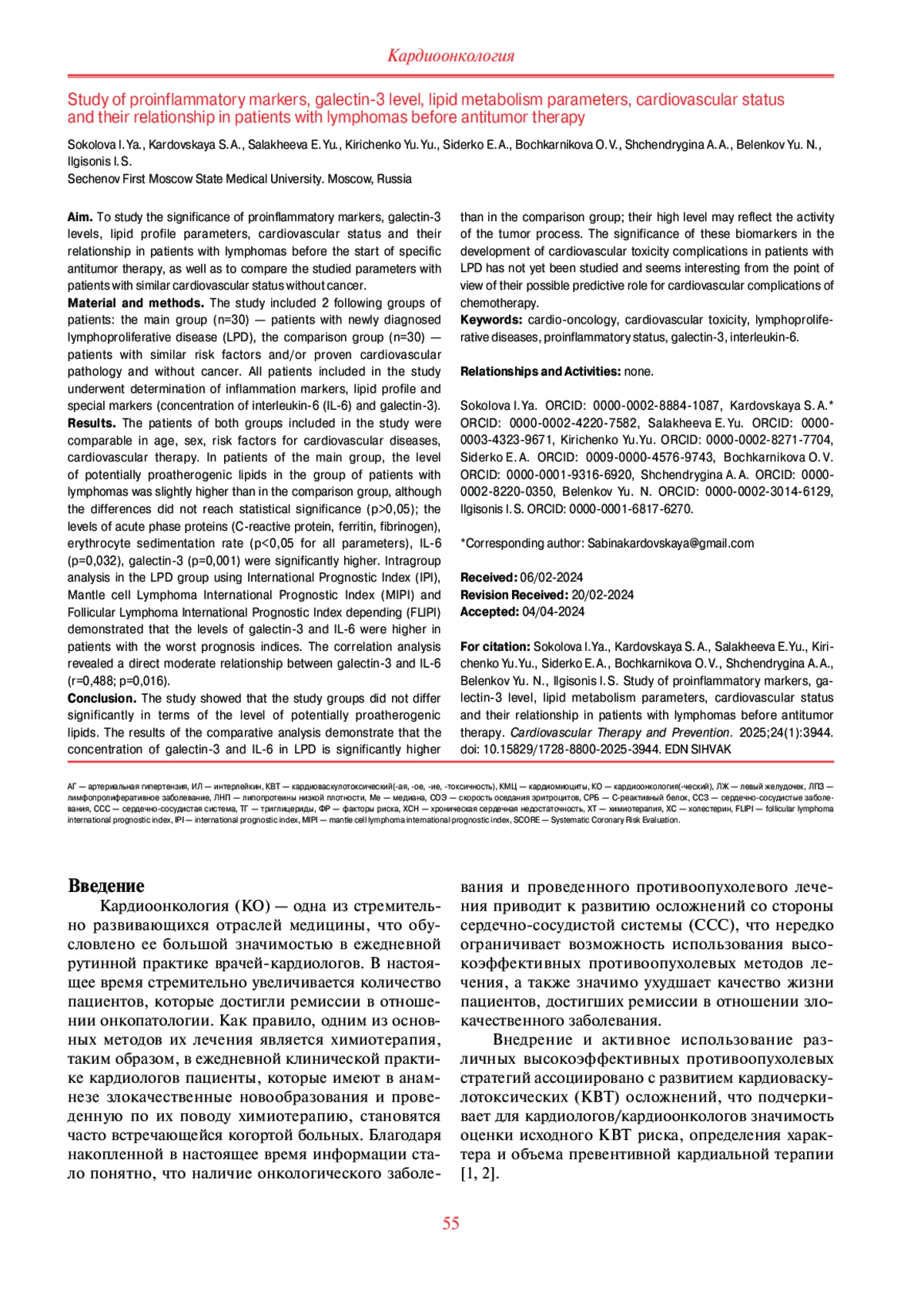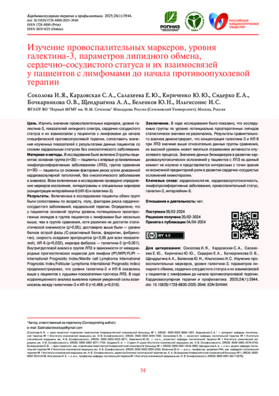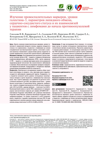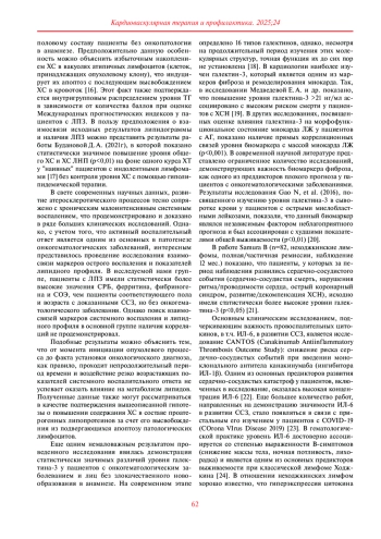 Заключение. В ходе исследования было показано, что исследуемые группы по уровню потенциально проатерогенных липидов статистически значимо не различались. Результаты сравнительного анализа демонстрируют, что концентрация галектина-3 и ИЛ-6 при ЛПЗ значимо выше относительно данных группы сравнения, их высокий уровень может являться отражением активности опухолевого процесса. Значение данных биомаркеров в развитии кардиоваскулотоксических осложнений у пациентов с ЛПЗ на данный момент не изучено и представляется интересным с точки зрения их возможной предикторной роли в развитии сердечно-сосудистых осложнений химиотерапии.