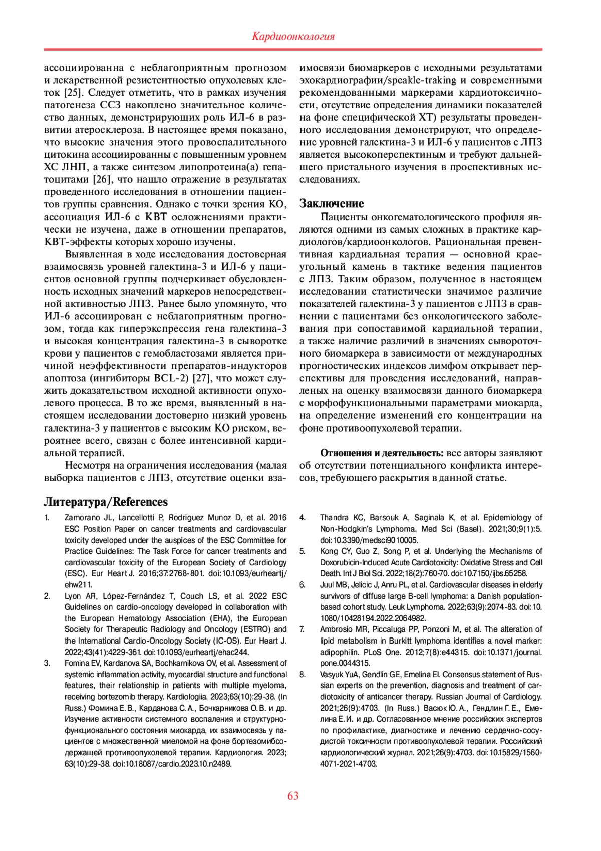 8. Васюк Ю. А., Гендлин Г. Е., Емелина Е. И. и др. Согласованное мнение российских экспертов по профилактике, диагностике и лечению сердечно-сосудистой токсичности противоопухолевой терапии. Российский кардиологический журнал. 2021;26(9):4703. DOI: 10.15829/1560-4071-2021-4703