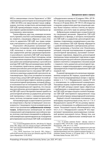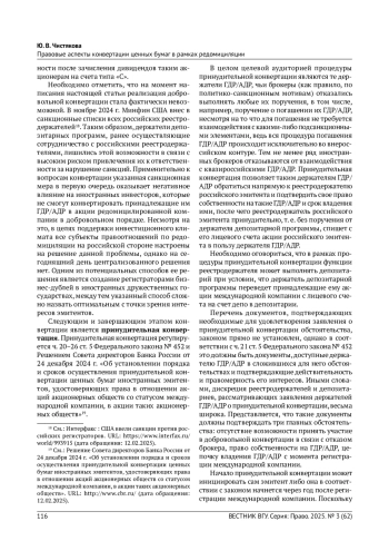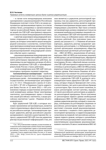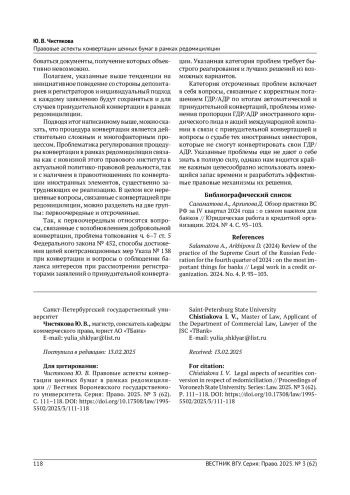 ЧИСТЯКОВА Ю.В. ПРАВОВЫЕ АСПЕКТЫ КОНВЕРТАЦИИ ЦЕННЫХ БУМАГ В РАМКАХ РЕДОМИЦИЛЯЦИИ // ВЕСТНИК ВОРОНЕЖСКОГО ГОСУДАРСТВЕННОГО УНИВЕРСИТЕТА. СЕРИЯ: ПРАВО. 2025. № 3 (62) (33 СТ.)