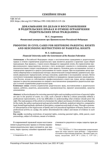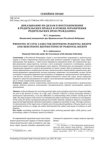 В Российской Федерации споры о восстановлении гражданина в родительских правах и отмене ограничения родительских прав являются редкими в практике судов общей юрисдикции. Как правило, с таким иском обращается гражданин лично, без привлечения профессионального представителя, поэтому у него возникают сложности в понимании, какими доказательствами следует подтверждать свою правоту. Основная цель исследования состоит в определении предмета и средств доказывания по таким спорам. При исследовании автор применял общенаучные и специальные методы: аналитический и индуктивный, сравнительно-правовой, формально-юридический, методы описания, сравнения и исследования случаев. Путем системного толкования правовых норм семейного и гражданско-процессуального законодательства России, исходя из собственного профессионального опыта как судьи, автор определил предмет и средства доказывания по спорам о восстановлении гражданина в родительских правах и отмене ограничения родительских прав.