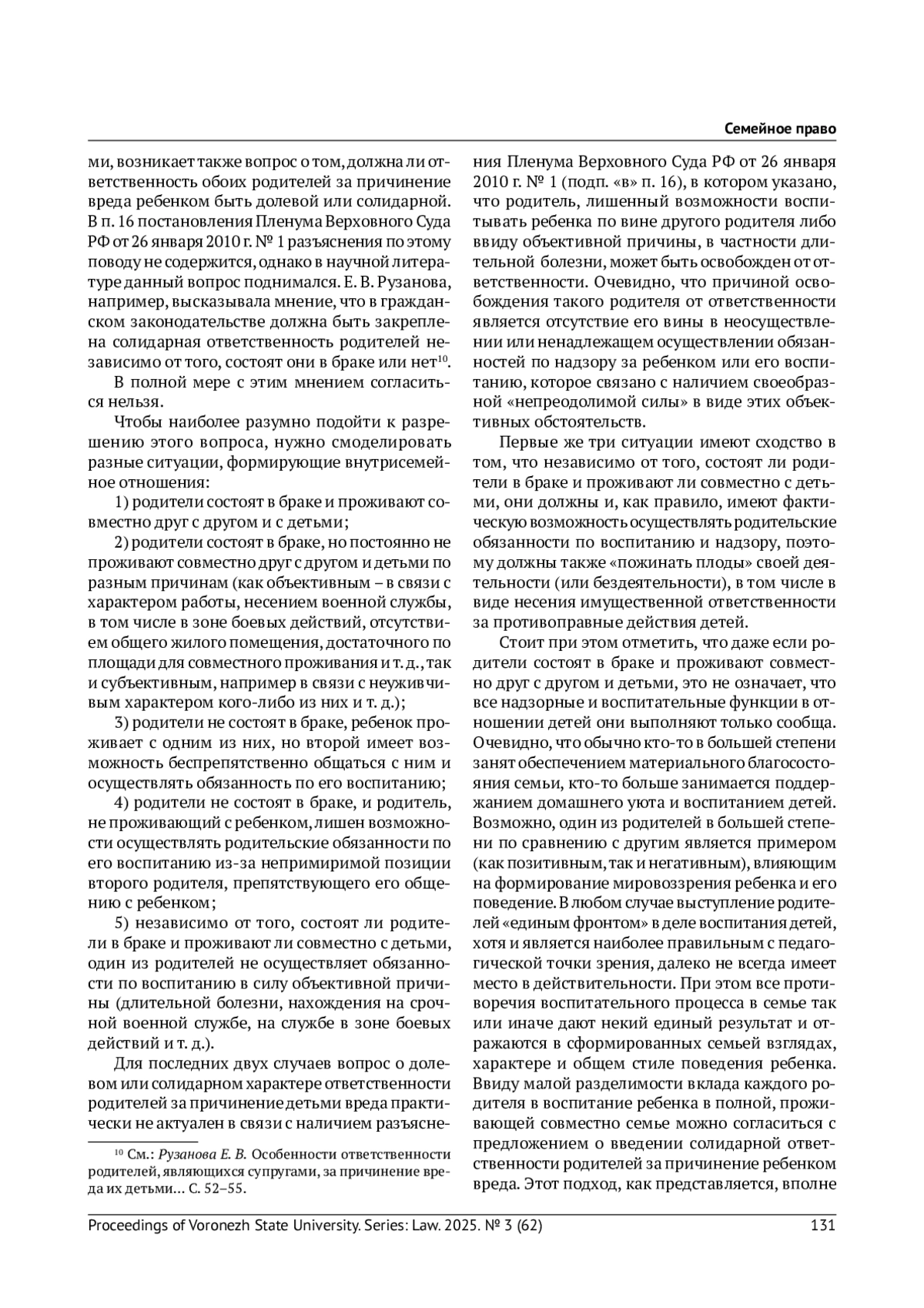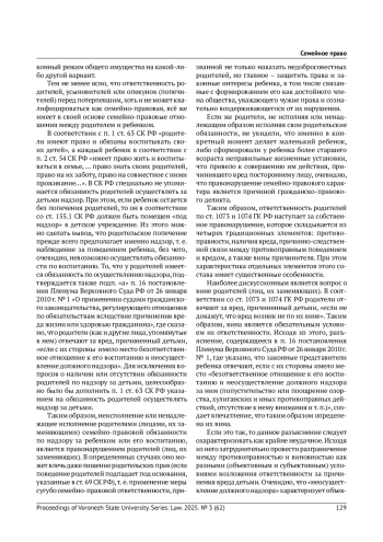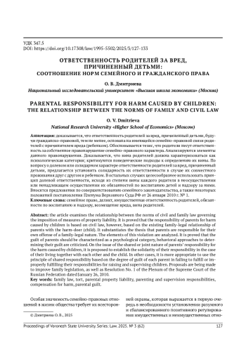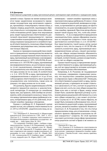 6. Рузанова Е. В. Особенности ответственности родителей, являющихся супругами, за причинение вреда их детьми: гражданско-правовой и семейно-правовой аспекты // Законы России: опыт, анализ, практика. 2019. № 1. С. 52-55. EDN: YYMVWH