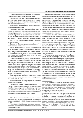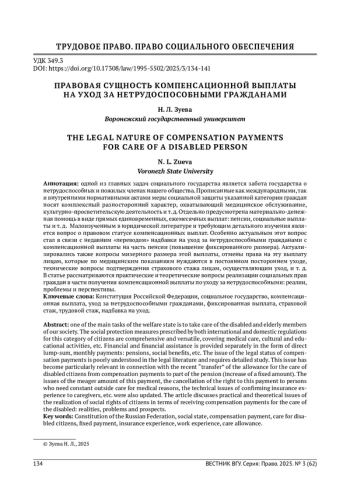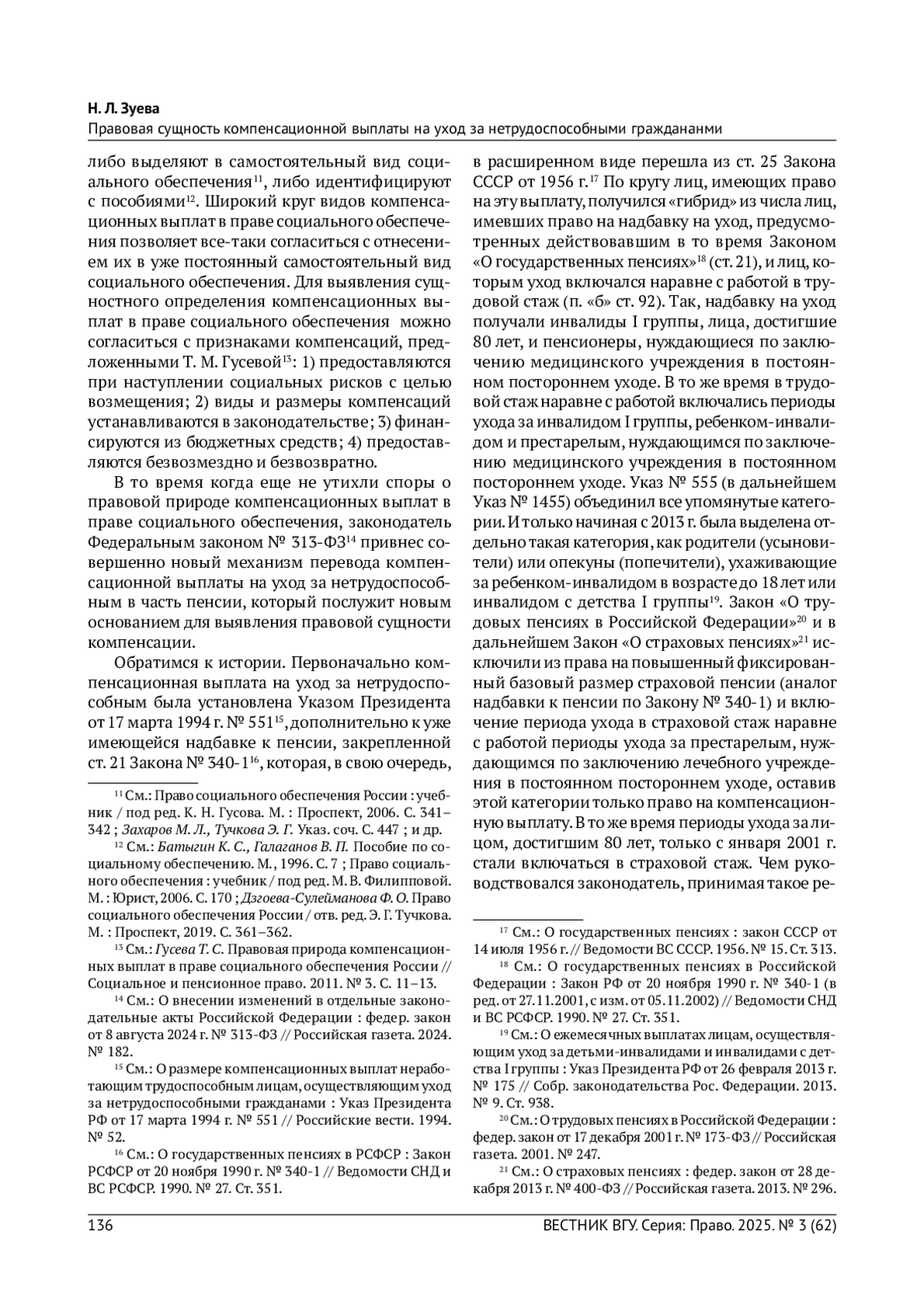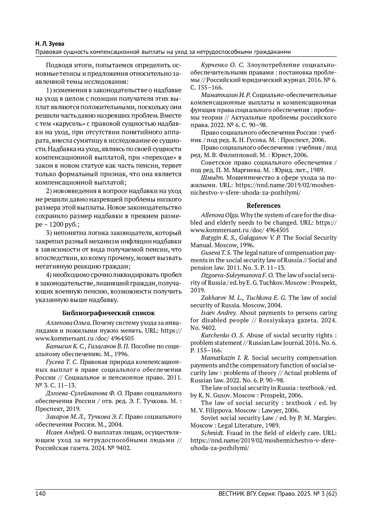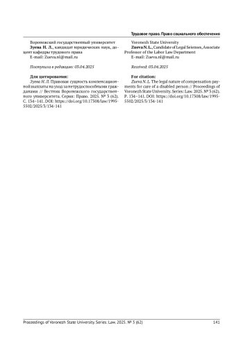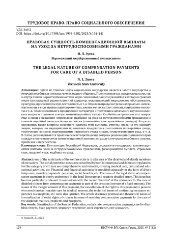 ЗУЕВА Н.Л. ПРАВОВАЯ СУЩНОСТЬ КОМПЕНСАЦИОННОЙ ВЫПЛАТЫ НА УХОД ЗА НЕТРУДОСПОСОБНЫМИ ГРАЖДАНАМИ // ВЕСТНИК ВОРОНЕЖСКОГО ГОСУДАРСТВЕННОГО УНИВЕРСИТЕТА. СЕРИЯ: ПРАВО. 2025. № 3 (62)
