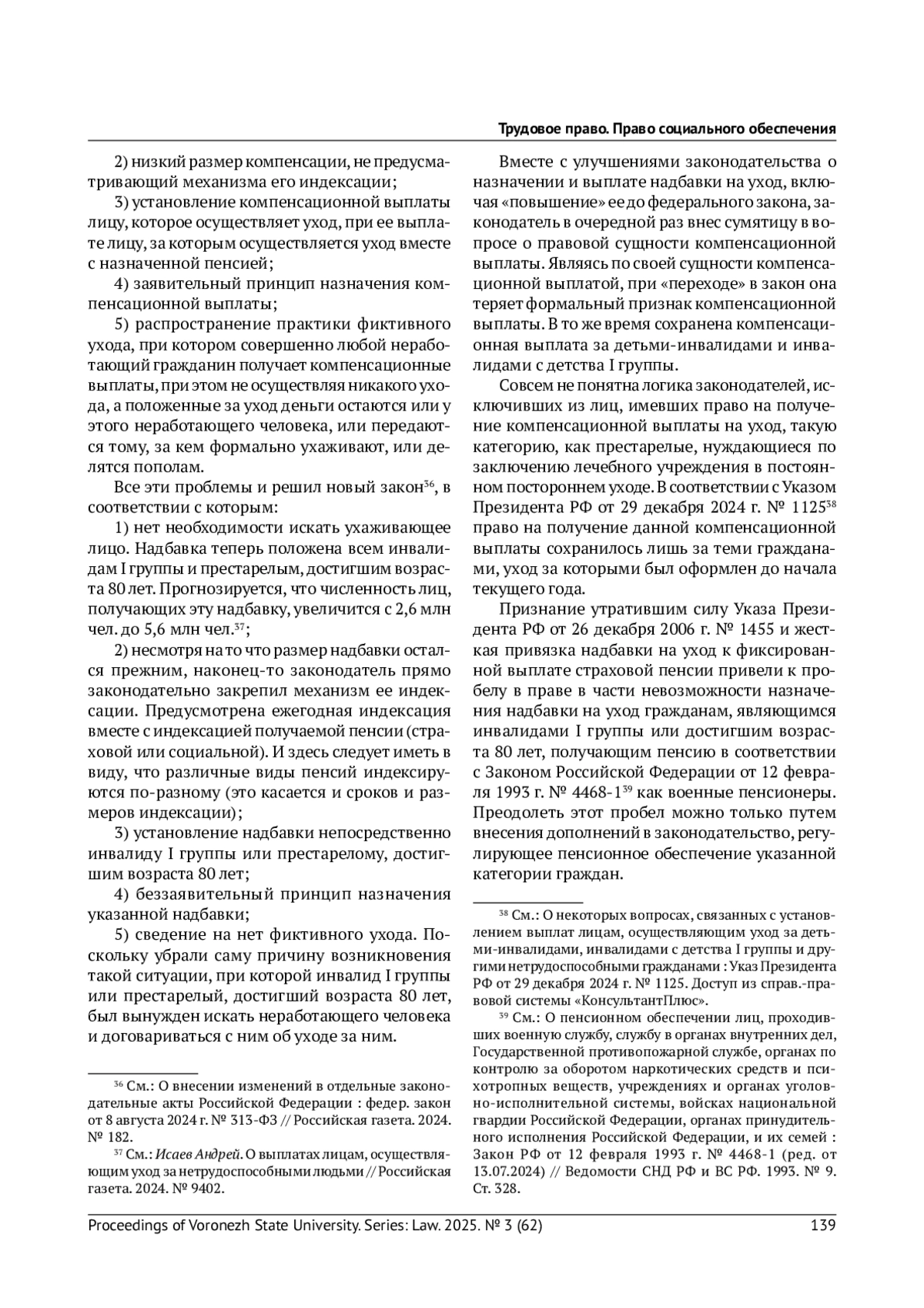 Статья: ПРАВОВАЯ СУЩНОСТЬ КОМПЕНСАЦИОННОЙ ВЫПЛАТЫ НА УХОД ЗА НЕТРУДОСПОСОБНЫМИ ГРАЖДАНАМИ (2025)