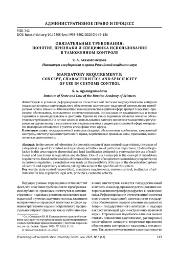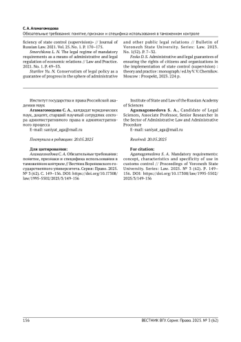 1. Агамагомедова С. А. Профилактика нарушений обязательных требований при проведении таможенного контроля и надзора: теоретико-правовые аспекты // Актуальные проблемы государства и права. 2024. Т. 8. № 2. С. 155-165. EDN: JRIEZY