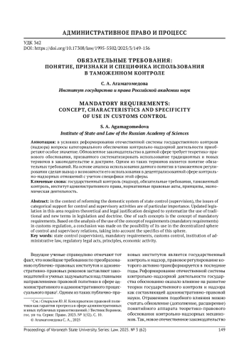 В условиях реформирования отечественной системы государственного контроля (надзора) вопросы категориального обеспечения контрольно-надзорной деятельности приобретают особое значение. Обновленное законодательство в данной сфере требует теоретико-правового обоснования, призванного систематизировать использование традиционных и новых терминов в законодательстве и доктрине. Одним из таких терминов является понятие обязательных требований. На основе анализа использования данного понятия в таможенном регулировании сделан вывод о возможности его использования в децентрализованной сфере контрольно-надзорных отношений с учетом специфики этой сферы.