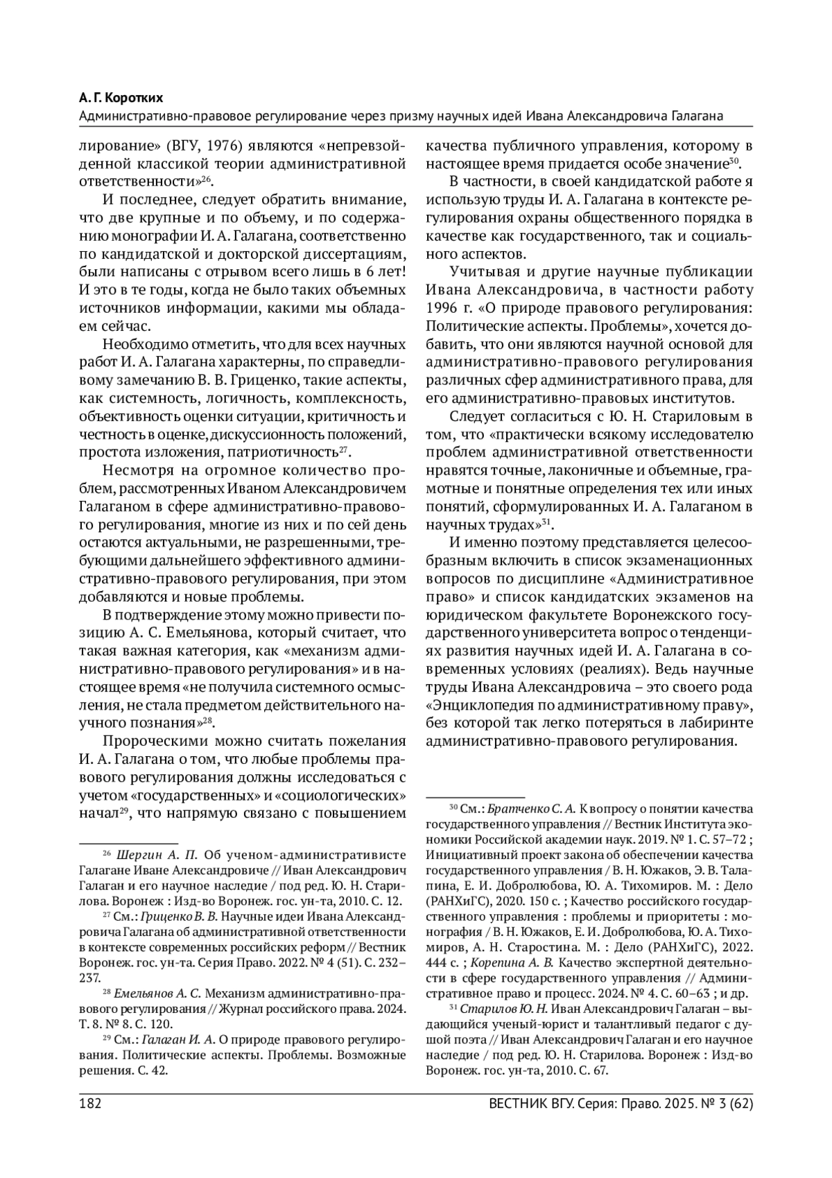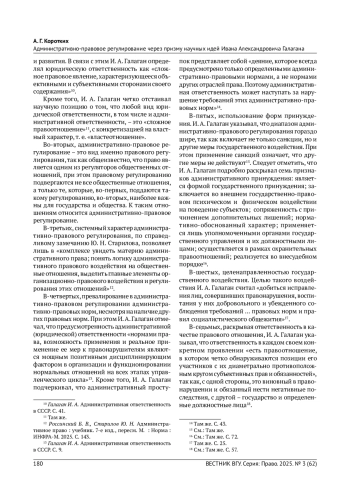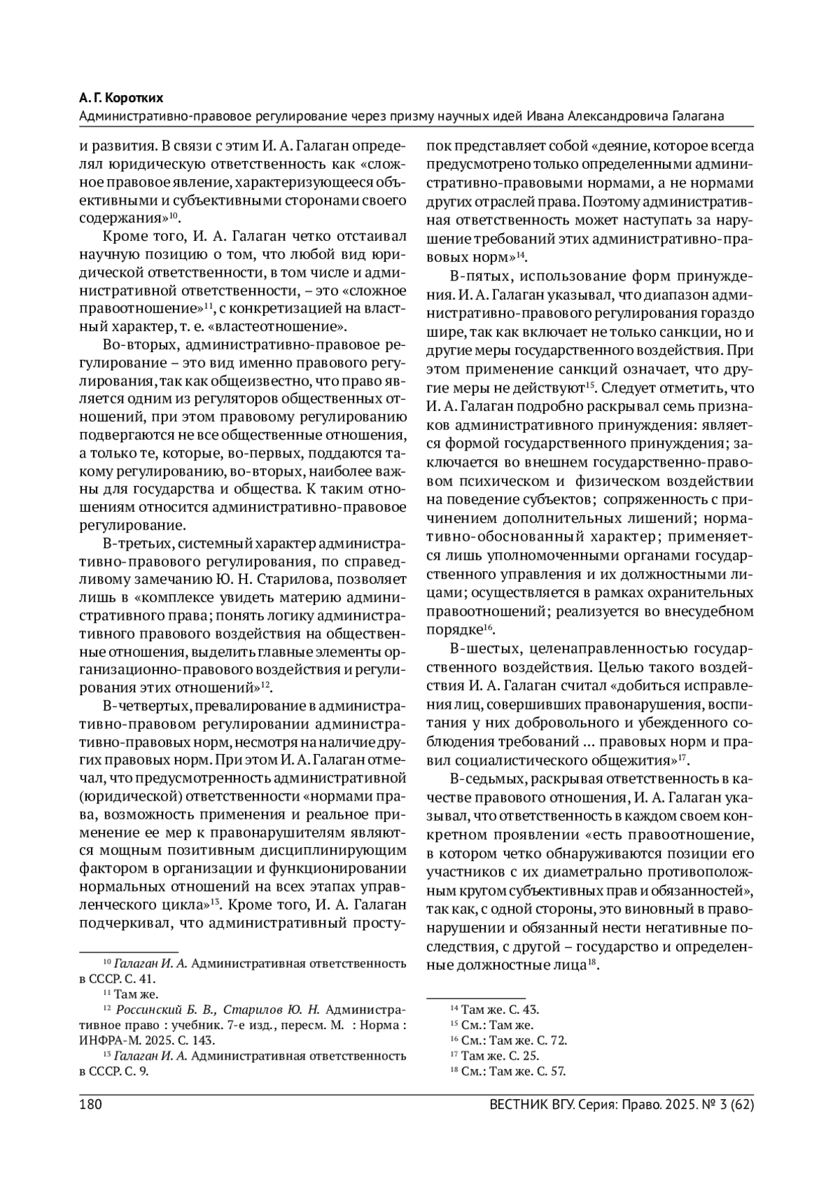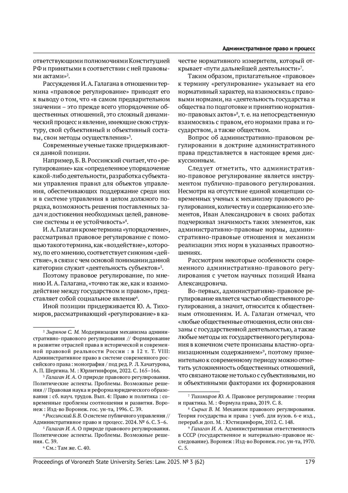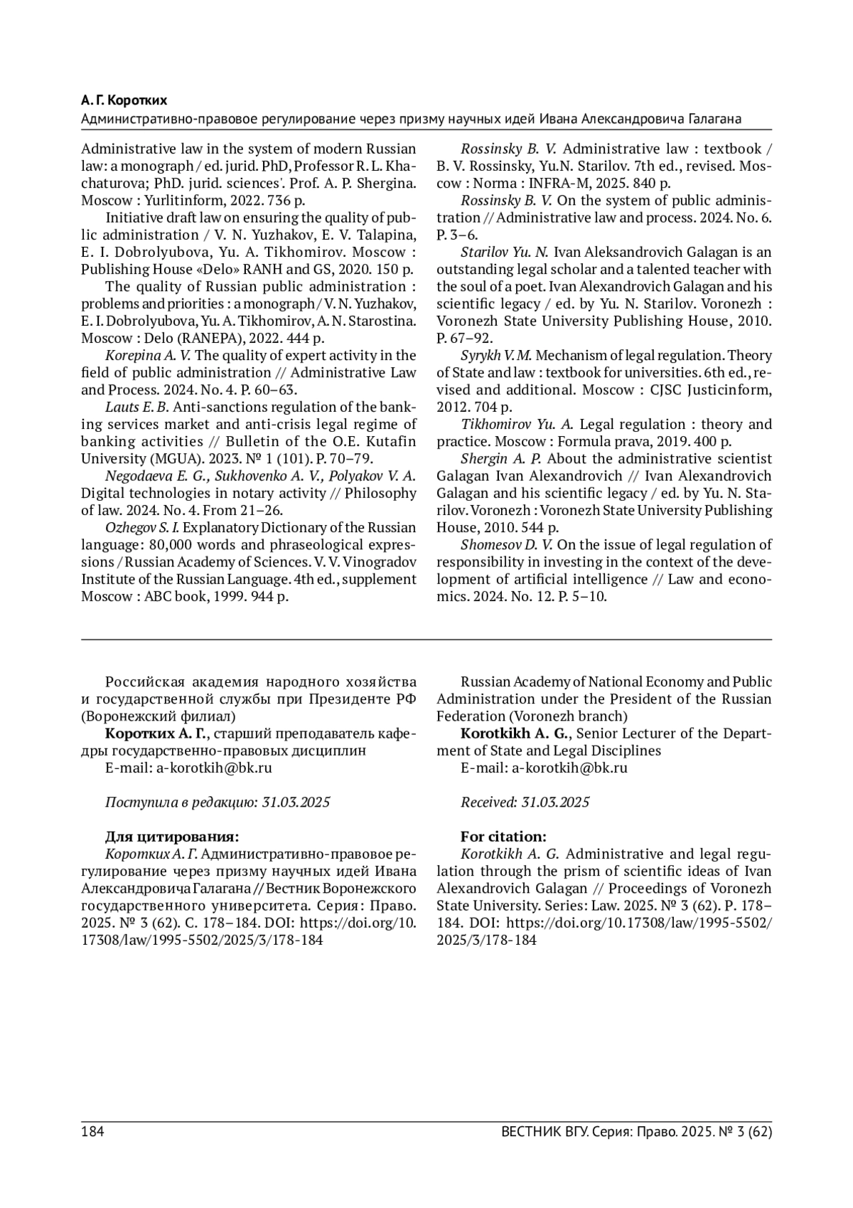 КОРОТКИХ А.Г. АДМИНИСТРАТИВНО-ПРАВОВОЕ РЕГУЛИРОВАНИЕ ЧЕРЕЗ ПРИЗМУ НАУЧНЫХ ИДЕЙ ИВАНА АЛЕКСАНДРОВИЧА ГАЛАГАНА // ВЕСТНИК ВОРОНЕЖСКОГО ГОСУДАРСТВЕННОГО УНИВЕРСИТЕТА. СЕРИЯ: ПРАВО. 2025. № 3 (62) (33 СТ.)