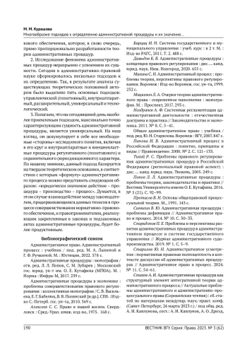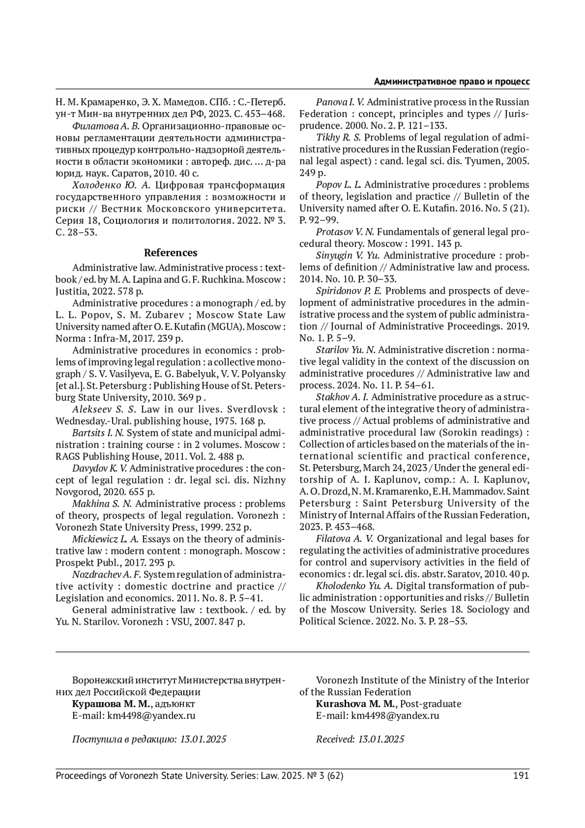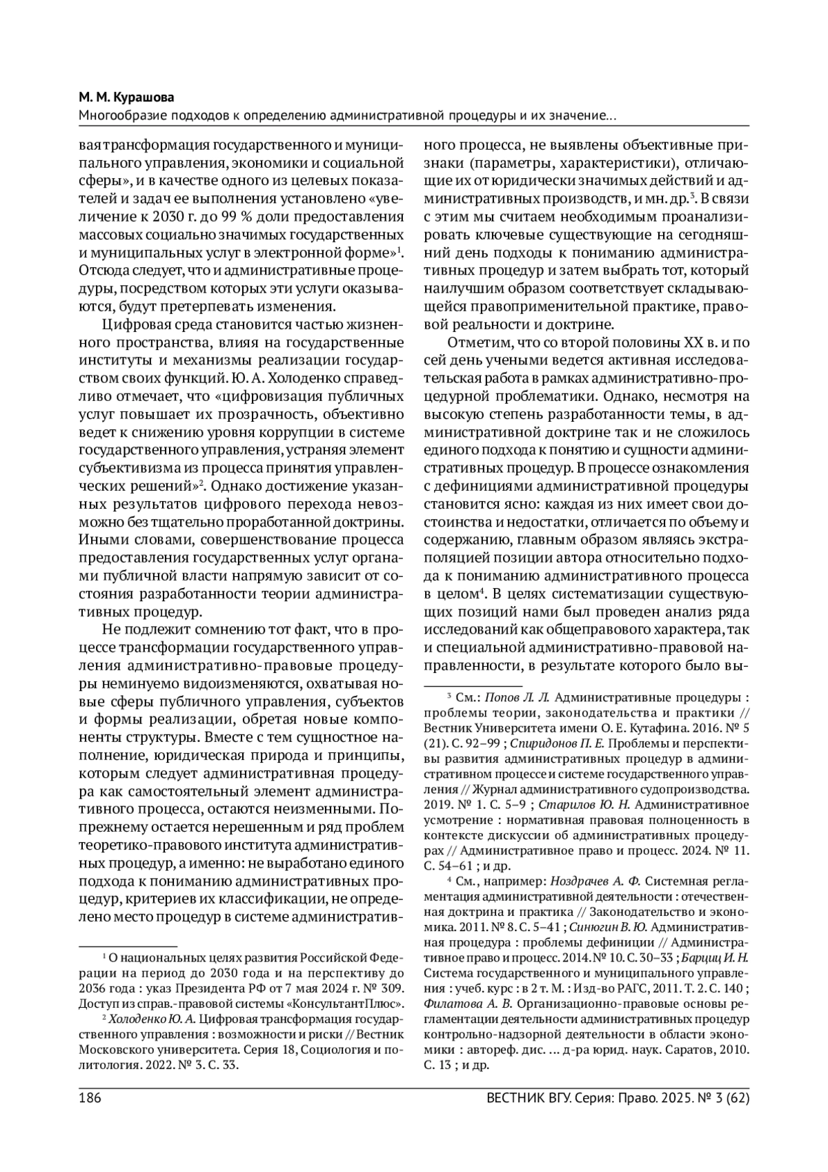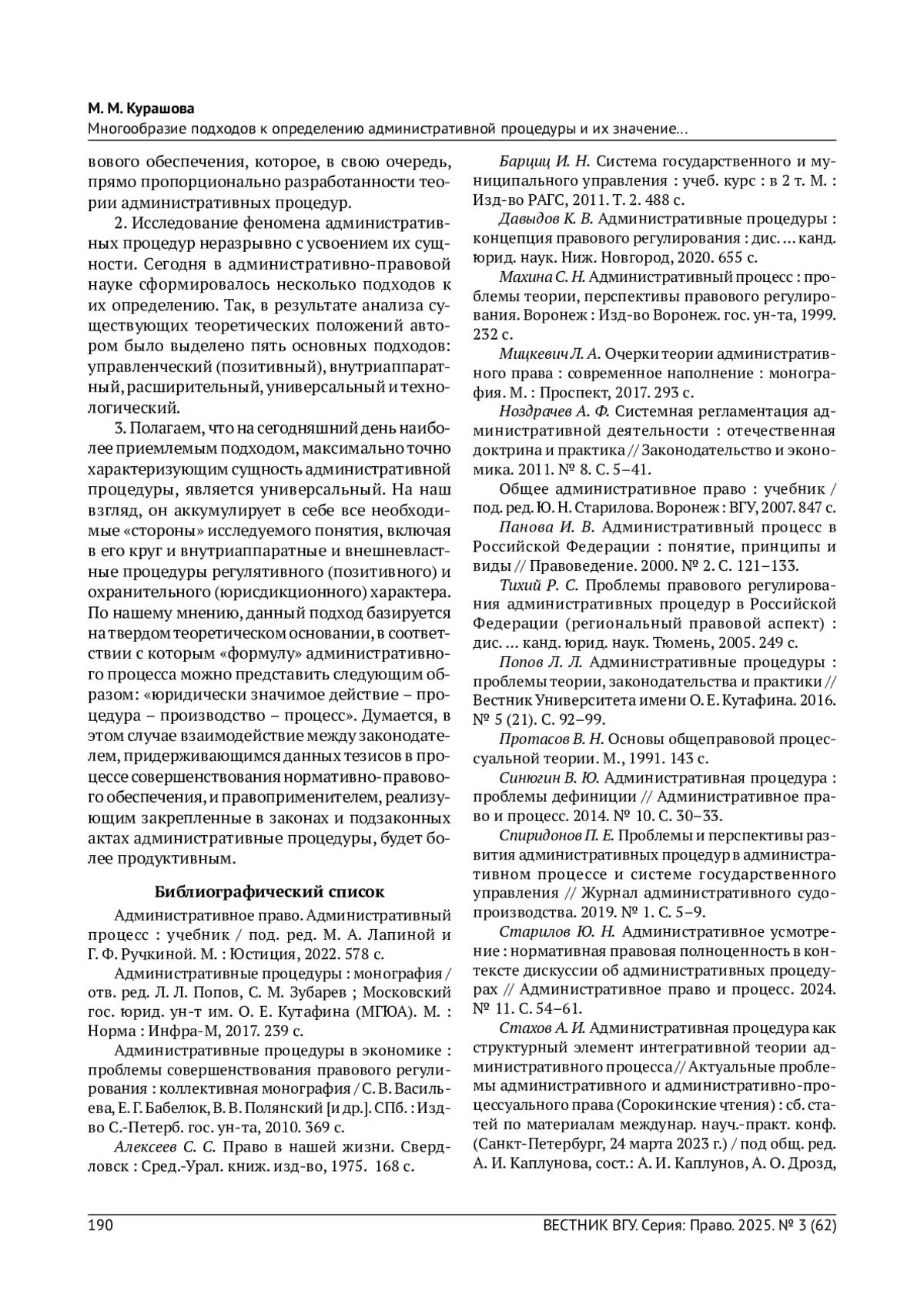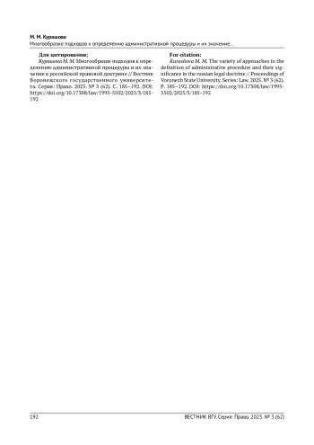 КУРАШОВА М.М. МНОГООБРАЗИЕ ПОДХОДОВ К ОПРЕДЕЛЕНИЮ АДМИНИСТРАТИВНОЙ ПРОЦЕДУРЫ И ИХ ЗНАЧЕНИЕ В РОССИЙСКОЙ ПРАВОВОЙ ДОКТРИНЕ // ВЕСТНИК ВОРОНЕЖСКОГО ГОСУДАРСТВЕННОГО УНИВЕРСИТЕТА. СЕРИЯ: ПРАВО. 2025. № 3 (62) (33 СТ.)