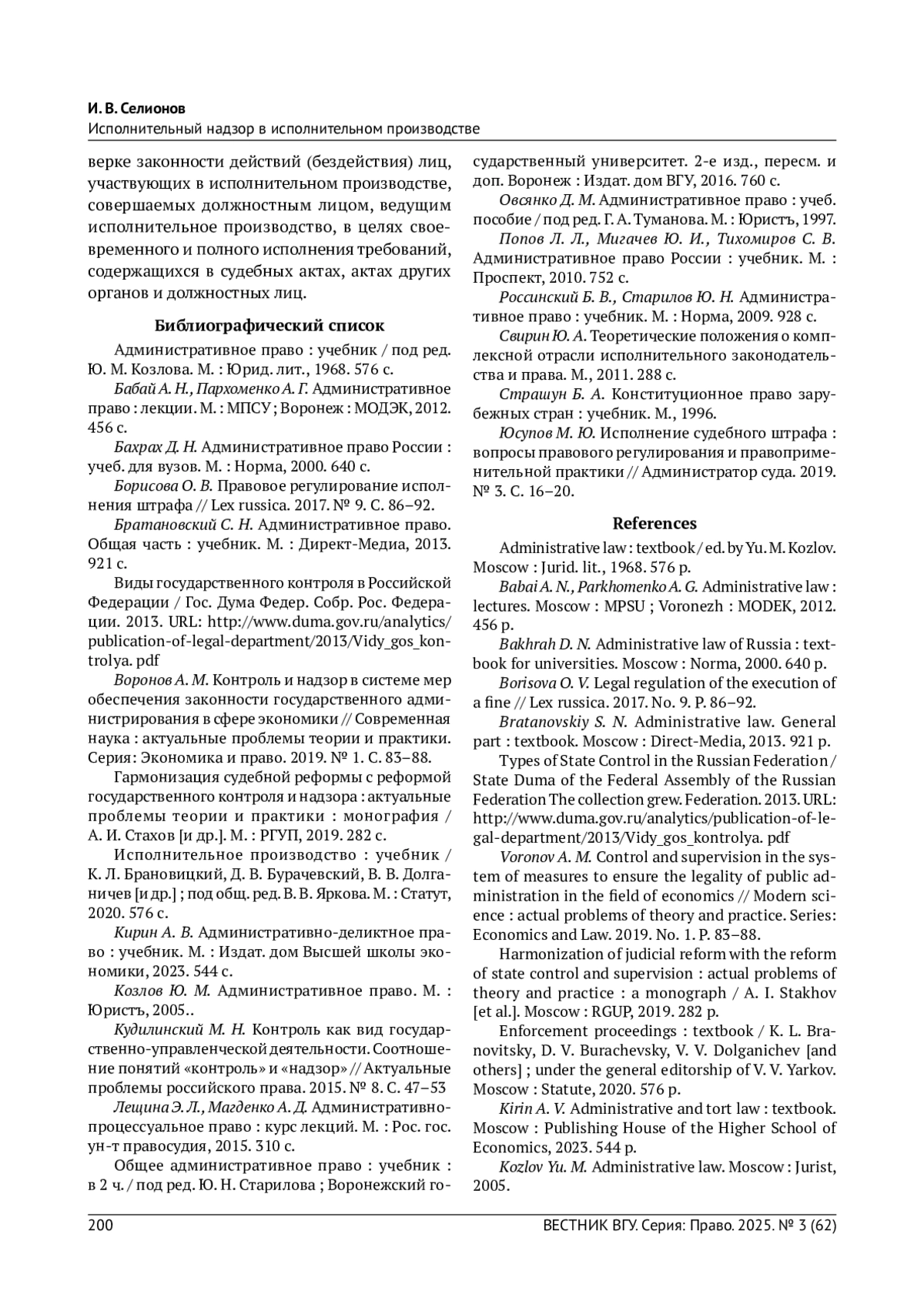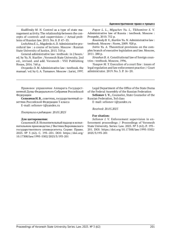7. Воронов А. М. Контроль и надзор в системе мер обеспечения законности государственного администрирования в сфере экономики // Современная наука: актуальные проблемы теории и практики. Серия: Экономика и право. 2019. № 1. C. 83-88. EDN: PPGMOH