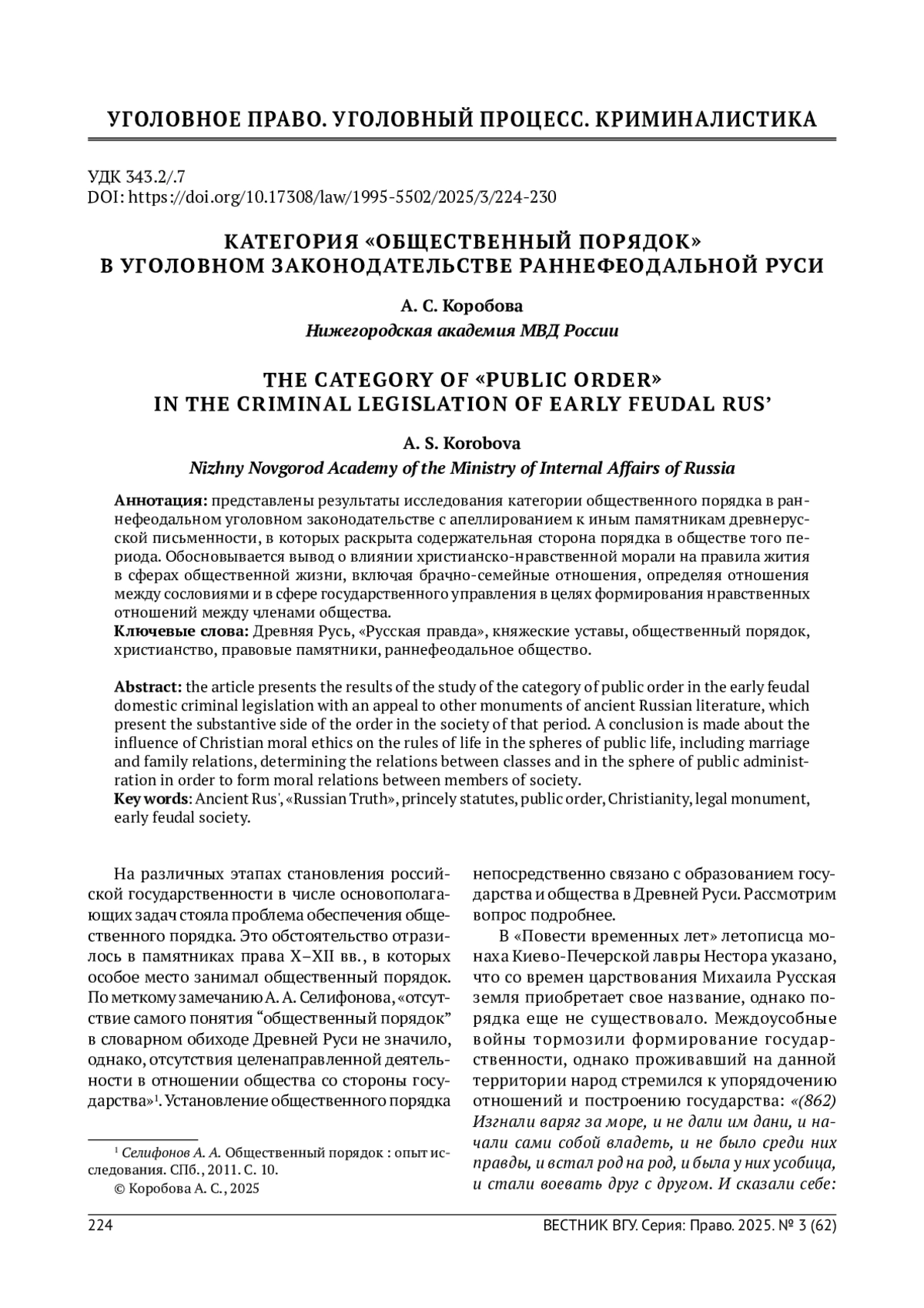 Представлены результаты исследования категории общественного порядка в раннефеодальном уголовном законодательстве с апеллированием к иным памятникам древнерусской письменности, в которых раскрыта содержательная сторона порядка в обществе того периода. Обосновывается вывод о влиянии христианско-нравственной морали на правила жития в сферах общественной жизни, включая брачно-семейные отношения, определяя отношения между сословиями и в сфере государственного управления в целях формирования нравственных отношений между членами общества.