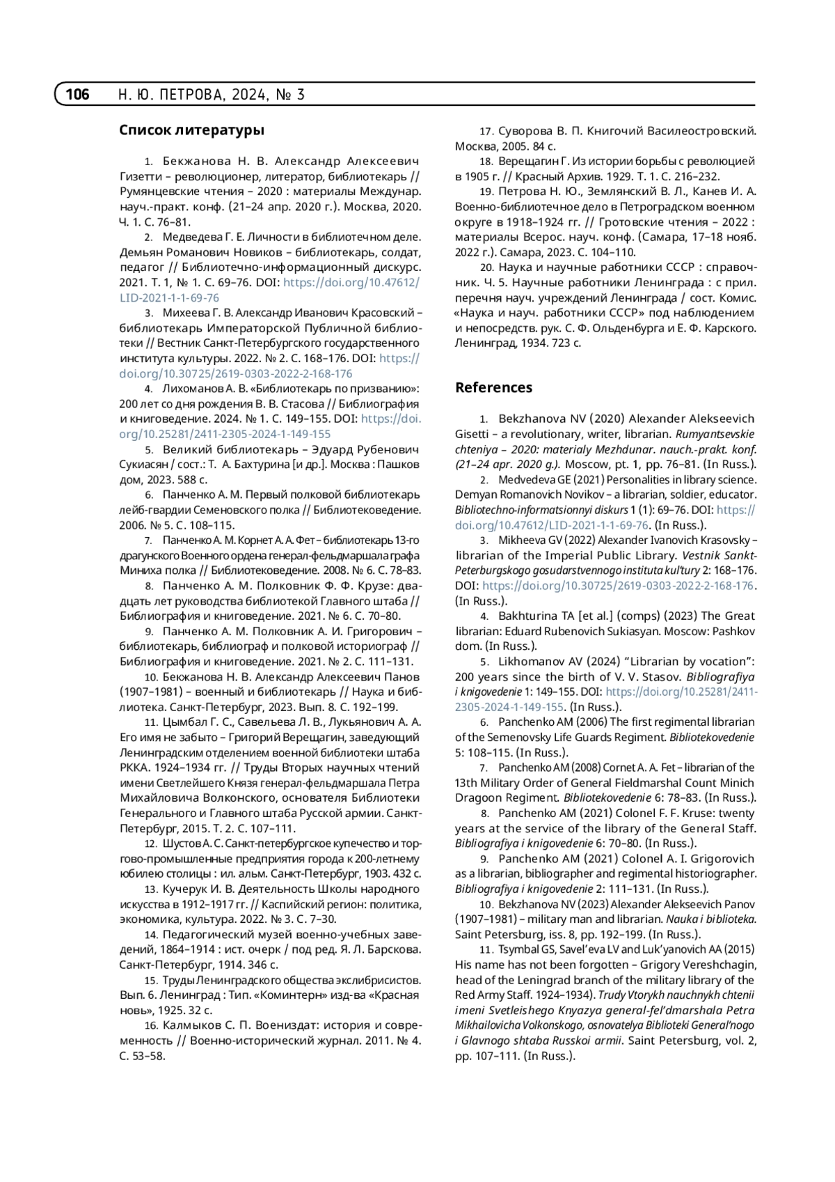 10. Бекжанова Н. В. Александр Алексеевич Панов (1907-1981) - военный и библиотекарь // Наука и библиотека. Санкт-Петербург, 2023. Вып. 8. С. 192-199.