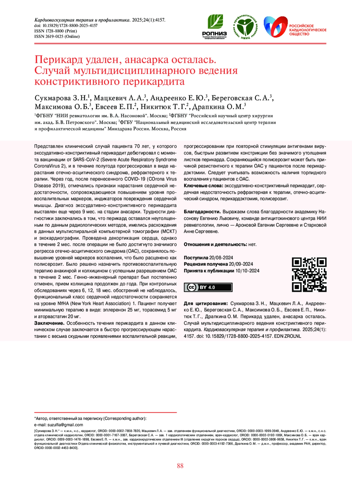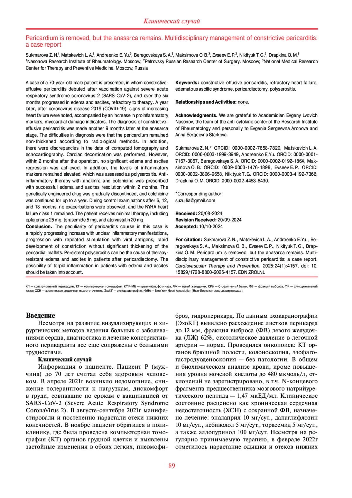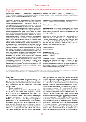 Представлен клинический случай пациента 70 лет, у которого экссудативно-констриктивный перикардит дебютировал с момента вакцинации от SARS-CoV-2 (Severe Acute Respiratory Syndrome CoronaVirus 2), и в течение полугода прогрессировал в виде нарастания отечно-асцитического синдрома, рефрактерного к терапии. Через год, после перенесенного COVID-19 (COrona VIrus Disease 2019), отмечались признаки нарастания сердечной недостаточности, сопровождающиеся повышением уровня провоспалительных маркеров, индикаторов повреждения сердечной мышцы. Диагноз экссудативно-констриктивного перикардита выставлен еще через 9 мес. на стадии анасарки. Трудности диагностики заключались в том, что перикард оставался неутолщенным по данным радиологических методов, имелись расхождения в данных мультиспиральной компьютерной томографии (МСКТ) и эхокардиографии. Проведена декортикация сердца, однако в течение 2 мес. после операции не было достигнуто значимого регресса отечно-асцитического синдрома (ОАС), сохранялось повышение уровней маркеров воспаления, что было расценено как полисерозит. Было решено назначить противовоспалительную терапию анакинрой и колхицином с успешным разрешением ОАС в течение 2 мес. Генно-инженерный препарат был постепенно отменен, прием колхицина продолжен до года. При контрольных обследованиях через 6, 12, 18 мес. обострений не наблюдалось, функциональный класс сердечной недостаточности сохраняется на уровне NYHA (New York Heart Association) 1. Пациент получает минимальную терапию в виде: эплеренон 25 мг, торасемид 5 мг и аторвастатин 20 мг.