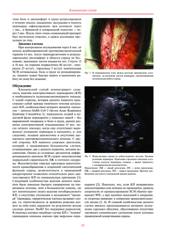 Заключение. Особенность течения перикардита в данном клиническом случае заключается в быстро прогрессирующем нарастании с весьма скудными проявлениями воспалительной реакции, прогрессировании при повторной стимуляции антигенами вирусов, быстрым развитием констрикции без значимого утолщения листков перикарда. Сохраняющийся полисерозит может быть причиной резистентного к терапии ОАС у пациентов после перикардэктомии. Следует учитывать возможность наличия торпидного воспаления у пациентов с ОАС.