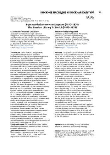 Цель статьи – представить результаты исторического анализа формирования и функционирования русской библиотеки в Цюрихе, организованной членами русской колонии в 1870 г., а также показать, что общественные дискуссии, происходившие в конце XIX в., по своему стилю очень напоминают современные интернет-дискуссии и, следовательно, могут рассматриваться как прообраз последних. Статья посвящена истории одной из первых русских общественных библиотек за рубежом, находившейся в Цюрихе (Швейцария) в первой половине 70-х гг. XIX в., которая была не просто библиотекой, хранилищем книг, а по сути, местом, где происходило формирование двух основных направлений русского революционного движения того времени: «бакунизма» (анархизм) и «лавринизма» (народничество), получивших названия по фамилиям своих лидеров М. А. Бакунина и П. Л. Лаврова. В первой части статьи излагается история возникновения библиотеки, приводится состав книжного фонда, обсуждаются способы его пополнения, характеризуются бухгалтерские документы, повествуется о судьбах создателей библиотеки, прежде всего, М. П. Сажина (Арман Росс), фактического создателя библиотеки, основного соратника Бакунина, который не просто собрал книжный фонд, но и организовал при библиотеке дискуссионный клуб, где происходили острые и злободневные дискуссии о самой библиотеке и о революционных событиях в России и в Европе. Такие дискуссии были очень эмоционально насыщенными, актуальными по содержанию, острыми по смыслу. Содержанию и анализу этих дискуссий будет посвящена вторая часть статьи, где будет показано и обосновано, что их можно рассматривать в качестве прообраза дискуссий в интернет-пространстве XXI в.