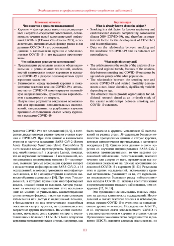8. Гамбарян М. Г., Драпкина О. М. Курение табака и COVID-19: старый враг в новом обличии. Обзор текущей научной литературы. Кардиоваскулярная терапия и профилактика. 2020;19(3):2604. DOI: 10.15829/1728-8800-2020-2604