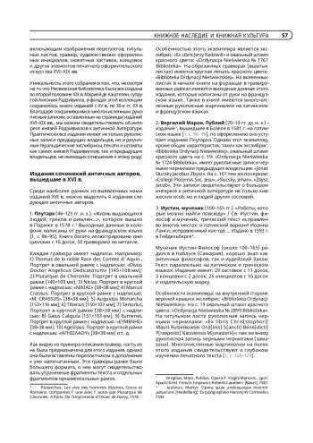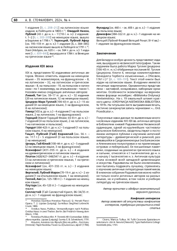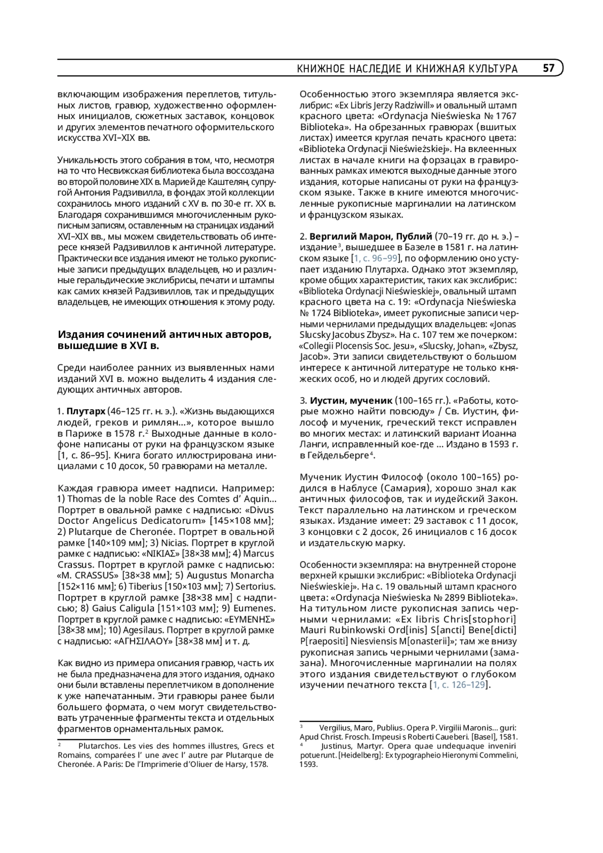 Цель статьи – представить результаты анализа книг античных авторов, выходивших в XVI–XIX вв., последней воссозданной во второй половине XIX в. книжной коллекции князей Радзивиллов Несвижской ординации. Истоки зарождения этого частновладельческого книжного собрания на территории современной Беларуси уходят корнями в XVI в. В статье представлен анализ и краткое описание выявленных экземпляров. Идентифицировано более 130 изданий, среди которых – сочинения античных поэтов (Гомер, Вергилий, Гораций, Овидий), баснописцев (Эзоп), риторов (Цицерон), историков (Фукидид, Ксенофонт, Цезарь, Корнелий Непот, Саллюстий, Тит Ливий, Плутарх, Евтропий), богословов (Иустин Философ, блаженный Иероним), философов (Платон, Сенека), драматургов (Теренций) как на древних (латинском и греческом), так и на современных европейских языках (французском, немецком, польском, итальянском). Книги античных авторов в составе коллекции отражают разнообразие европейского книгоиздания XVI–XIX вв.: представлены издания типографий Франции, Германии, Италии, Швейцарии, Голландии, Польши и Великого княжества Литовского. Особое место уделено авторским и владельческим записям, оставленным на полях экземпляров, в настоящее время хранящихся в Центральной научной библиотеке имени Якуба Коласа Национальной Академии наук Беларуси. Представленное многообразие изданий древнегреческих и римских авторов свидетельствует о постоянном интересе князей Радзивиллов к античному литературному наследию, лежащему в основе европейской культуры.