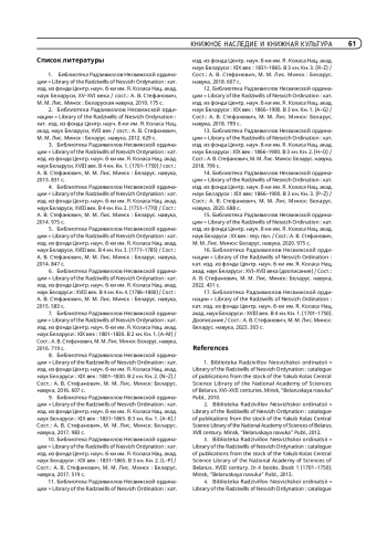 1. Библиотека Радзивиллов Несвижской ординации = Library of the Radziwills of Nesvizh Ordynation : кат. изд. из фонда Центр. науч. б-ки им. Я. Коласа Нац. акад. наук Беларуси, XV-XVI века / сост.: А. В. Стефанович, М. М. Лис. Минск : Беларуская навука, 2010. 175 с.