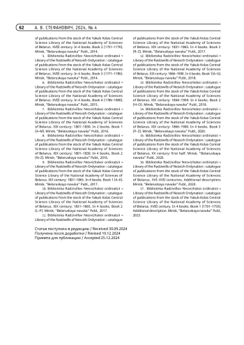 17. Библиотека Радзивиллов Несвижской ординации = Library of the Radziwills of Nesvizh Ordination : кат. изд. из фонда Центр. науч. б-ки им. Я. Коласа Нац. акад. наук Беларуси : XVIII век. В 4 кн. Кн. 1. (1701-1750). Доописание / Сост.: А. В. Стефанович, М. М. Лис. Минск: Беларус. навука, 2023. 303 с.