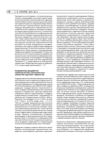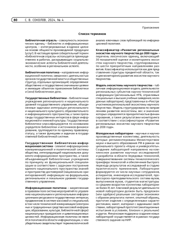СОКОЛОВ С. В. РАЗРАБОТКА ПОНЯТИЙНОГО АППАРАТА РЕГИОНАЛЬНЫХ ЭКОСИСТЕМ НАУЧНОГО ТВОРЧЕСТВА: ВЫЗОВ ДЛЯ БИБЛИОТЕЧНЫХ СПЕЦИАЛИСТОВ // ТРУДЫ ГПНТБ СО РАН. 2024. № 4