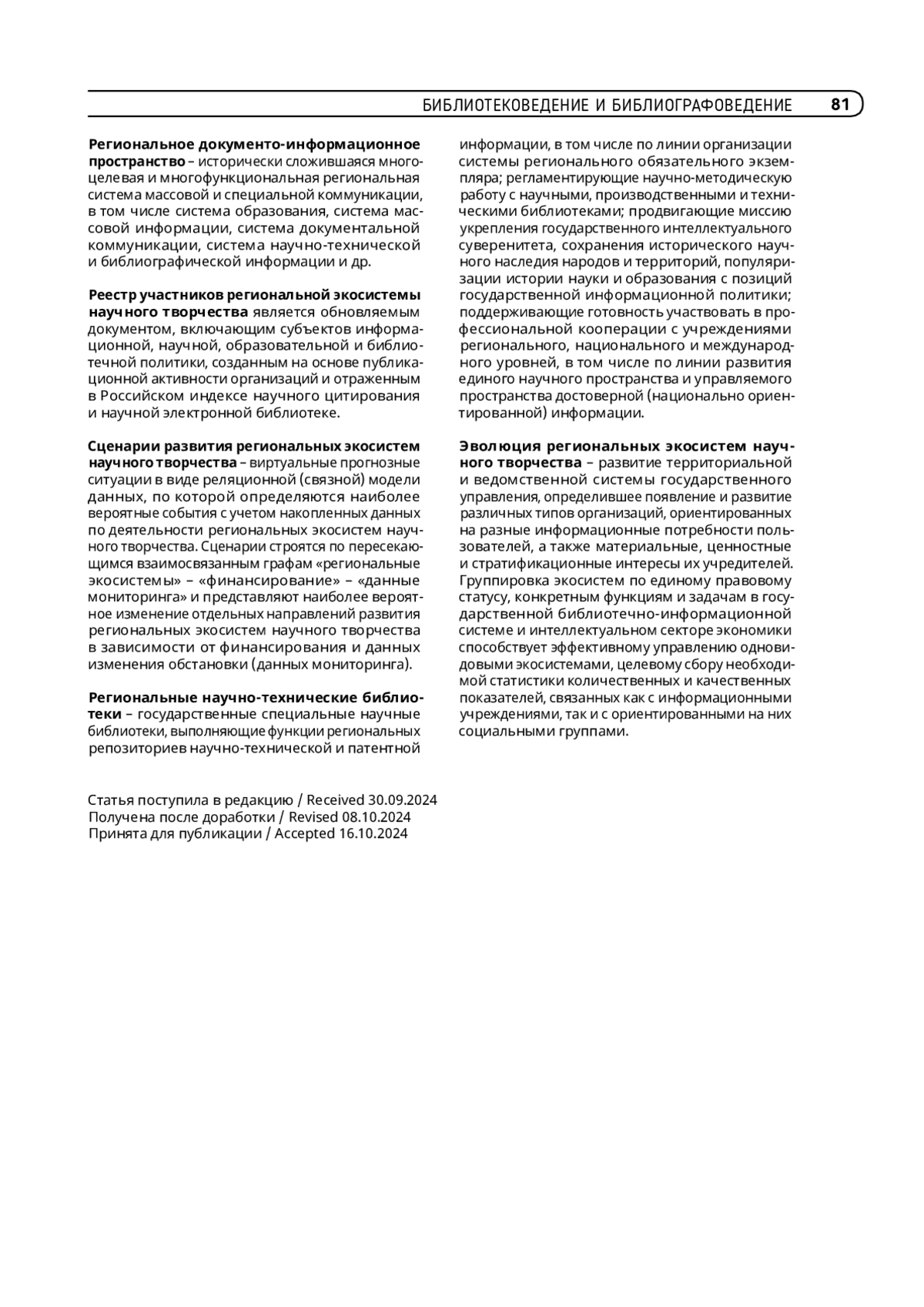Статья: Разработка понятийного аппарата региональных экосистем научного творчества: вызов для библиотечных специалистов (2024)