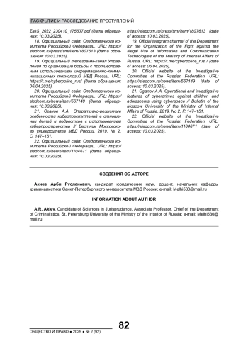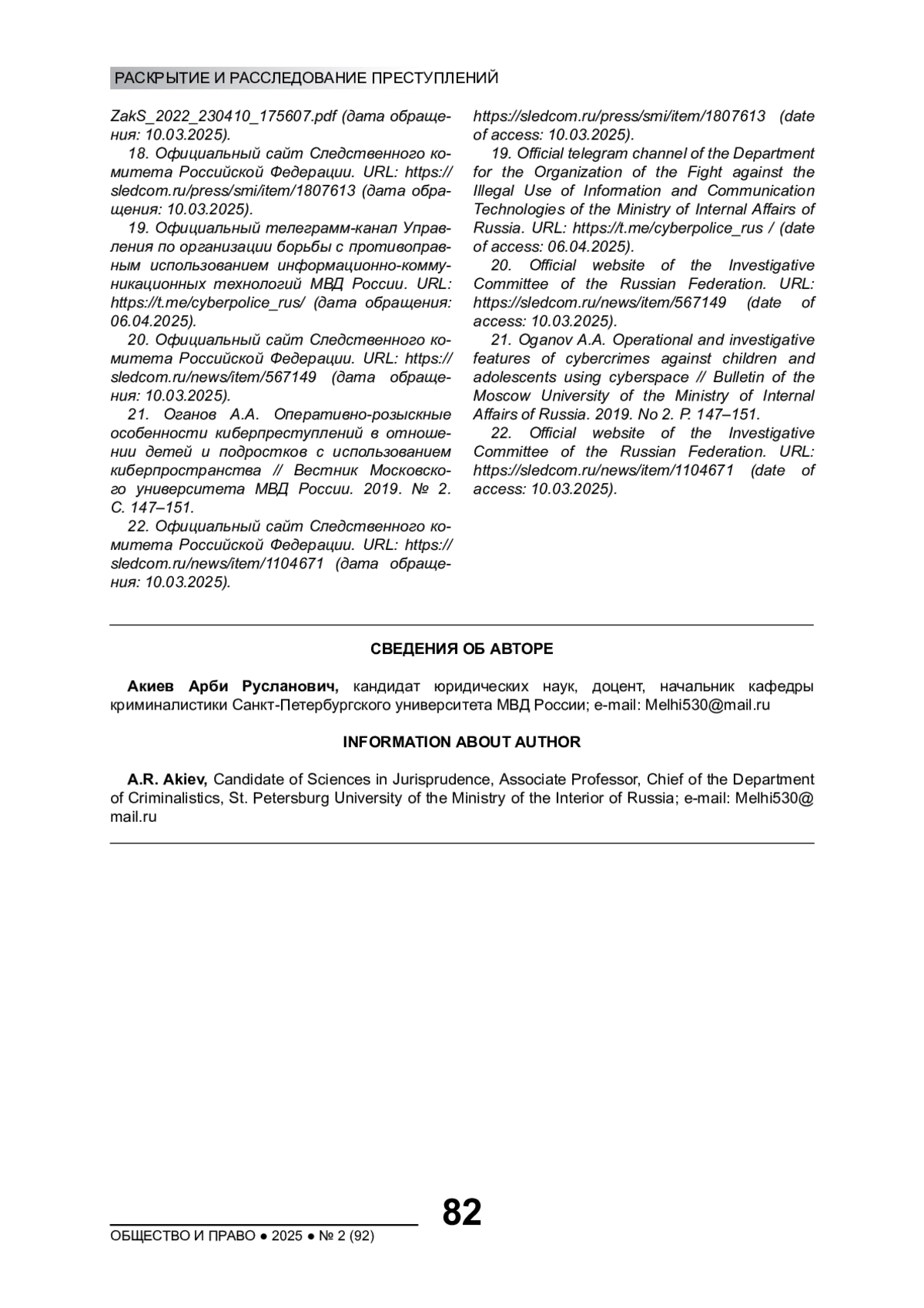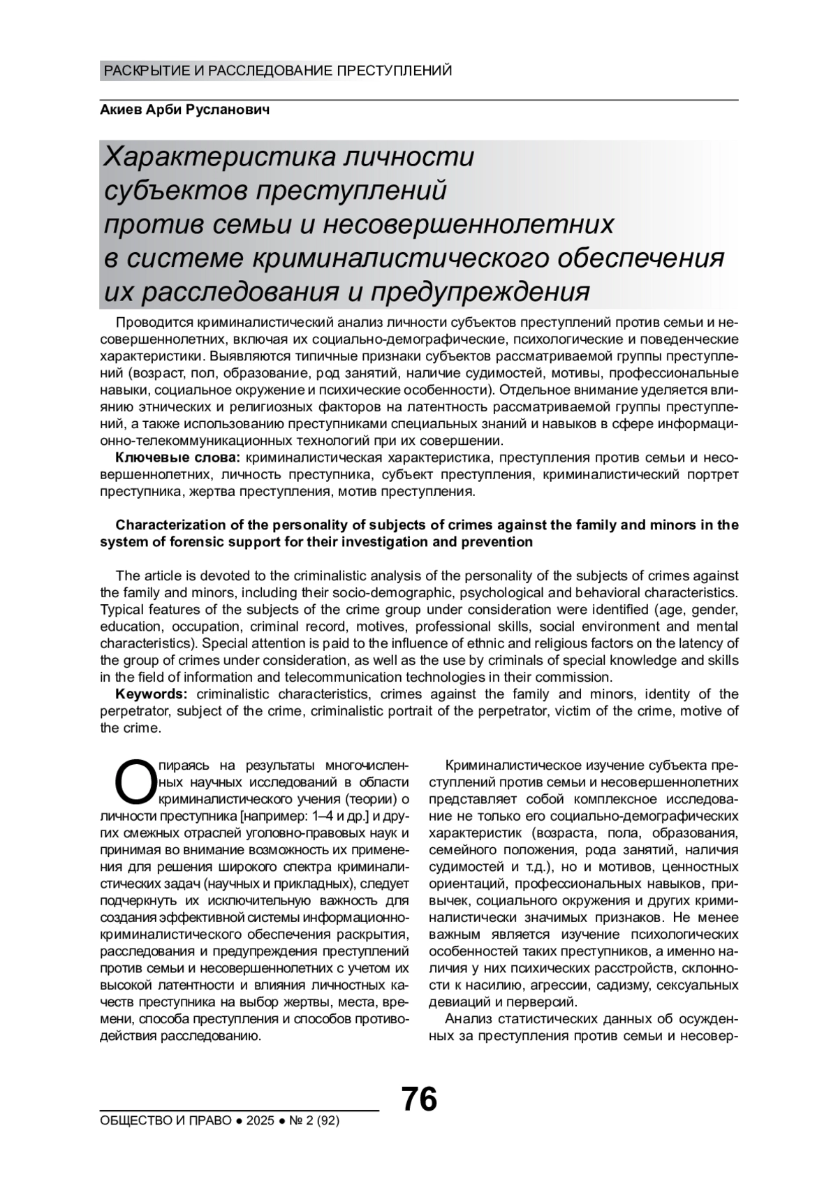 АКИЕВ А. Р. ХАРАКТЕРИСТИКА ЛИЧНОСТИ СУБЪЕКТОВ ПРЕСТУПЛЕНИЙ ПРОТИВ СЕМЬИ И НЕСОВЕРШЕННОЛЕТНИХ В СИСТЕМЕ КРИМИНАЛИСТИЧЕСКОГО ОБЕСПЕЧЕНИЯ ИХ РАССЛЕДОВАНИЯ И ПРЕДУПРЕЖДЕНИЯ // ОБЩЕСТВО И ПРАВО. 2025. № 2 (92)