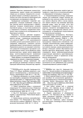 9. Черниговский В.Н. Актуальные вопросы применения дактилоскопических порошков для выявления следов рук с поверхности защитных пленок и чехлов мобильных устройств // Human Progress. 2024. Т. 10, вып. 8. URL: http://progress.human.com/images/2024/Tom10_8/Chernigovsky.pdf. EDN: KRKOMR