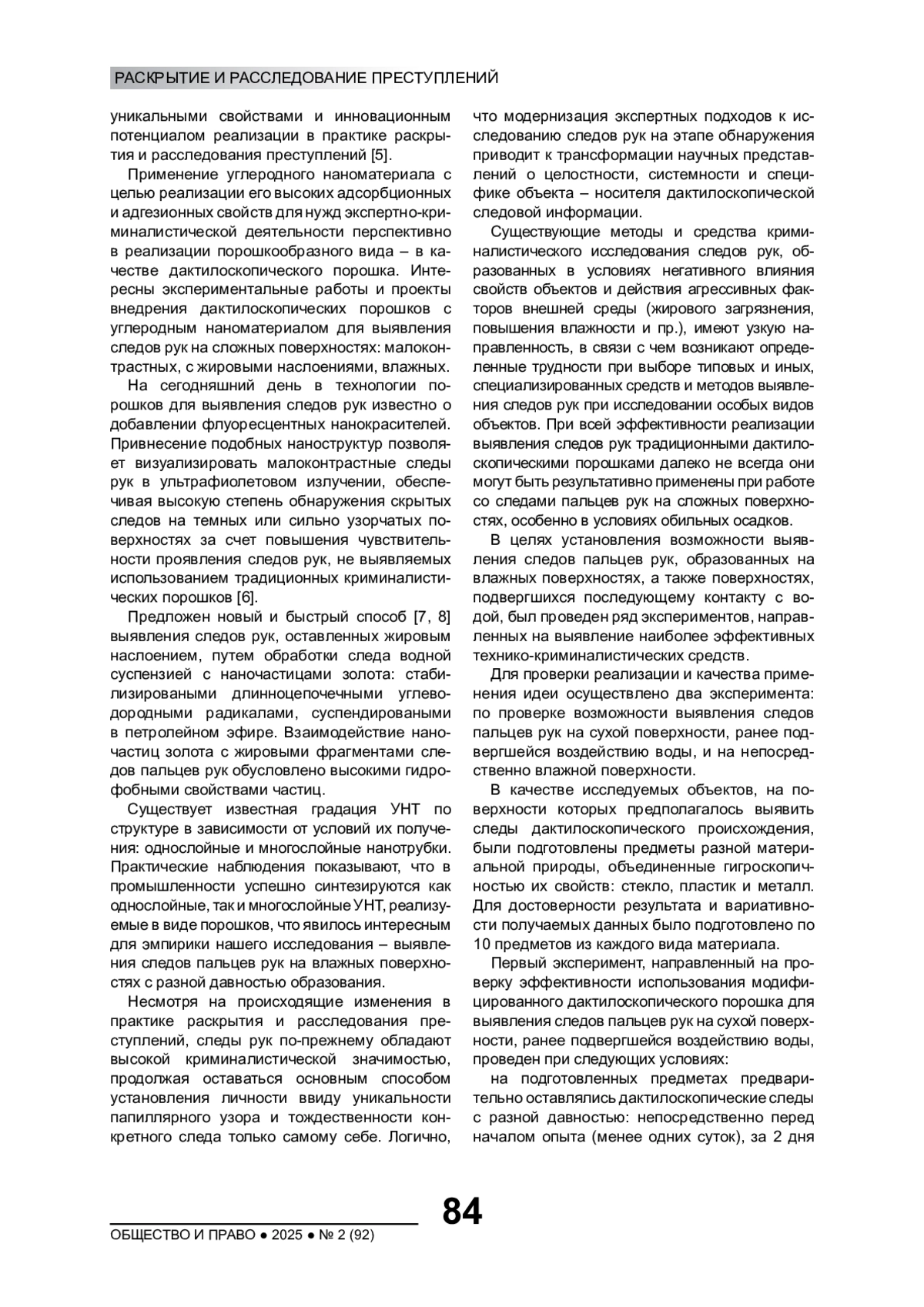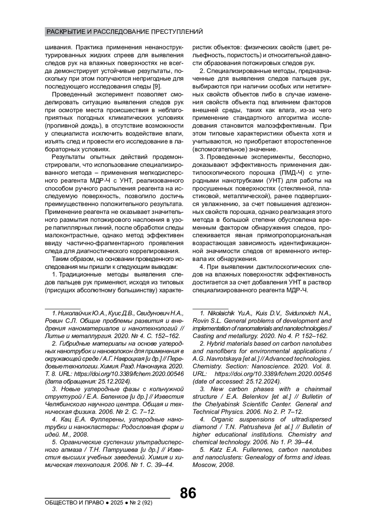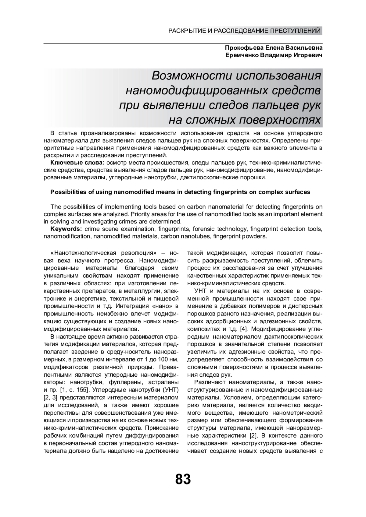 В статье проанализированы возможности использования средств на основе углеродного наноматериала для выявления следов пальцев рук на сложных поверхностях. Определены приоритетные направления применения наномодифицированных средств как важного элемента в раскрытии и расследовании преступлений