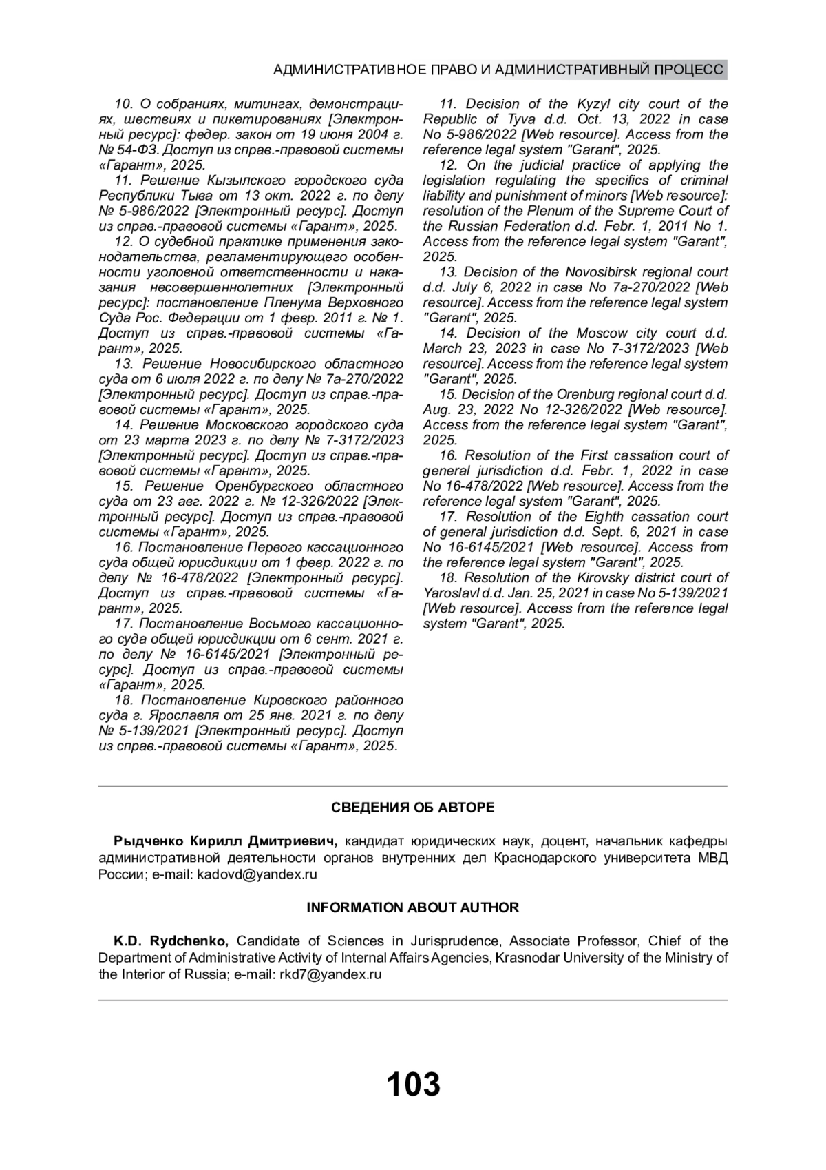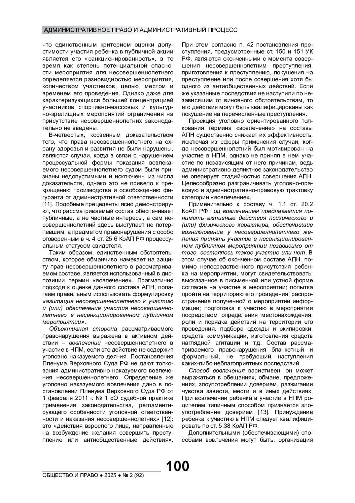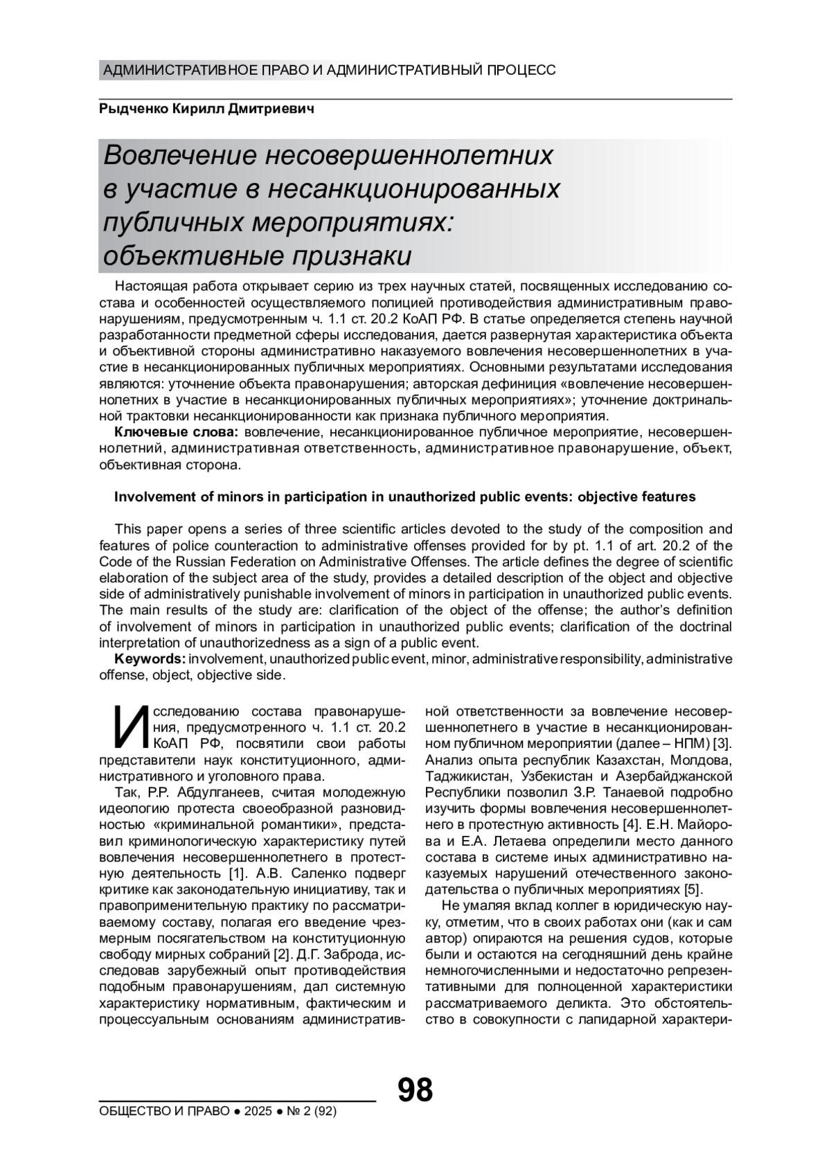 РЫДЧЕНКО К. Д. ВОВЛЕЧЕНИЕ НЕСОВЕРШЕННОЛЕТНИХ В УЧАСТИЕ В НЕСАНКЦИОНИРОВАННЫХ ПУБЛИЧНЫХ МЕРОПРИЯТИЯХ: ОБЪЕКТИВНЫЕ ПРИЗНАКИ // ОБЩЕСТВО И ПРАВО. 2025. № 2 (92)