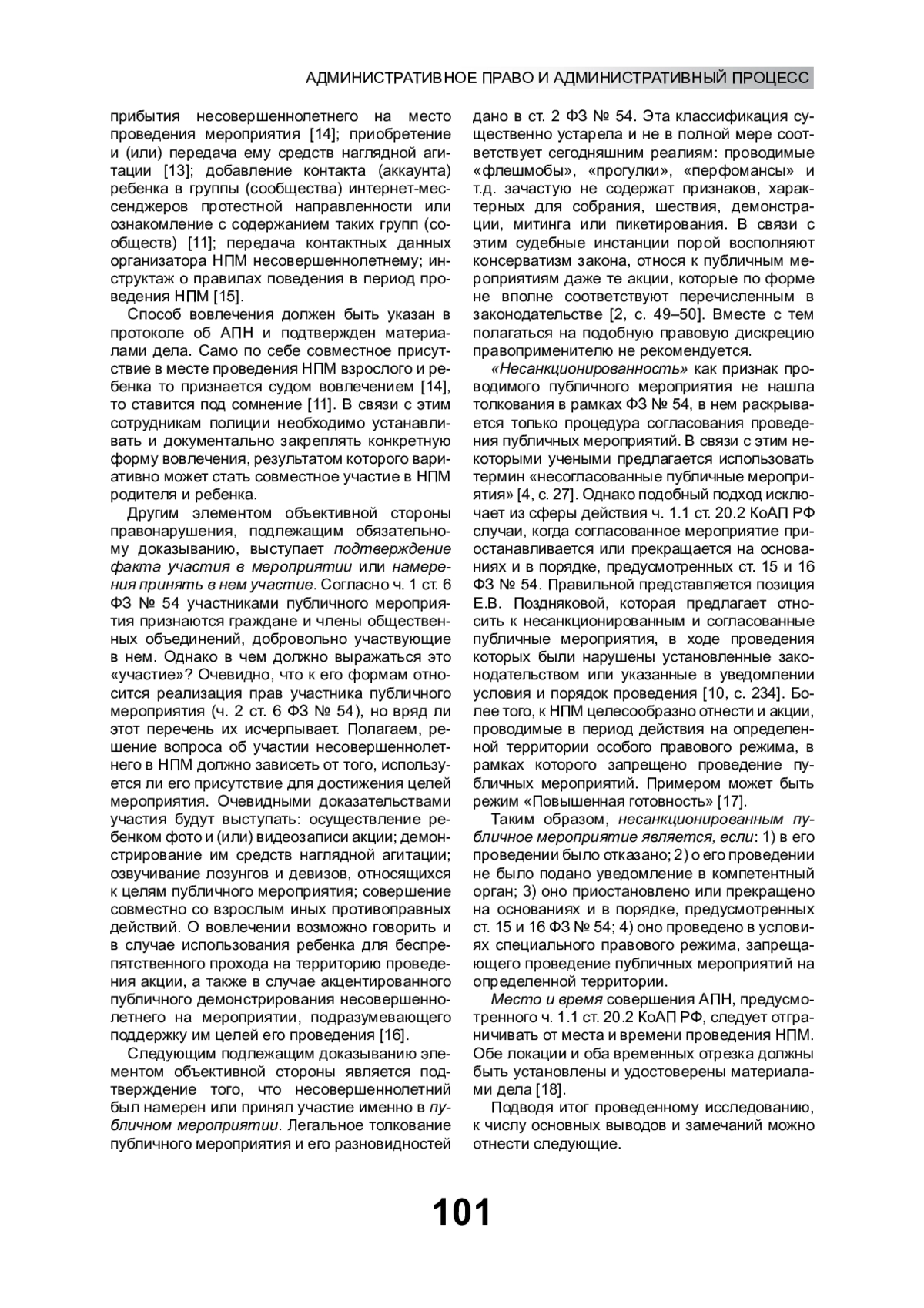 Настоящая работа открывает серию из трех научных статей, посвященных исследованию состава и особенностей осуществляемого полицией противодействия административным правонарушениям, предусмотренным ч. 1.1 ст. 20.2 КоАП РФ. В статье определяется степень научной разработанности предметной сферы исследования, дается развернутая характеристика объекта и объективной стороны административно наказуемого вовлечения несовершеннолетних в участие в несанкционированных публичных мероприятиях. Основными результатами исследования являются: уточнение объекта правонарушения; авторская дефиниция «вовлечение несовершеннолетних в участие в несанкционированных публичных мероприятиях»; уточнение доктринальной трактовки несанкционированности как признака публичного мероприятия.