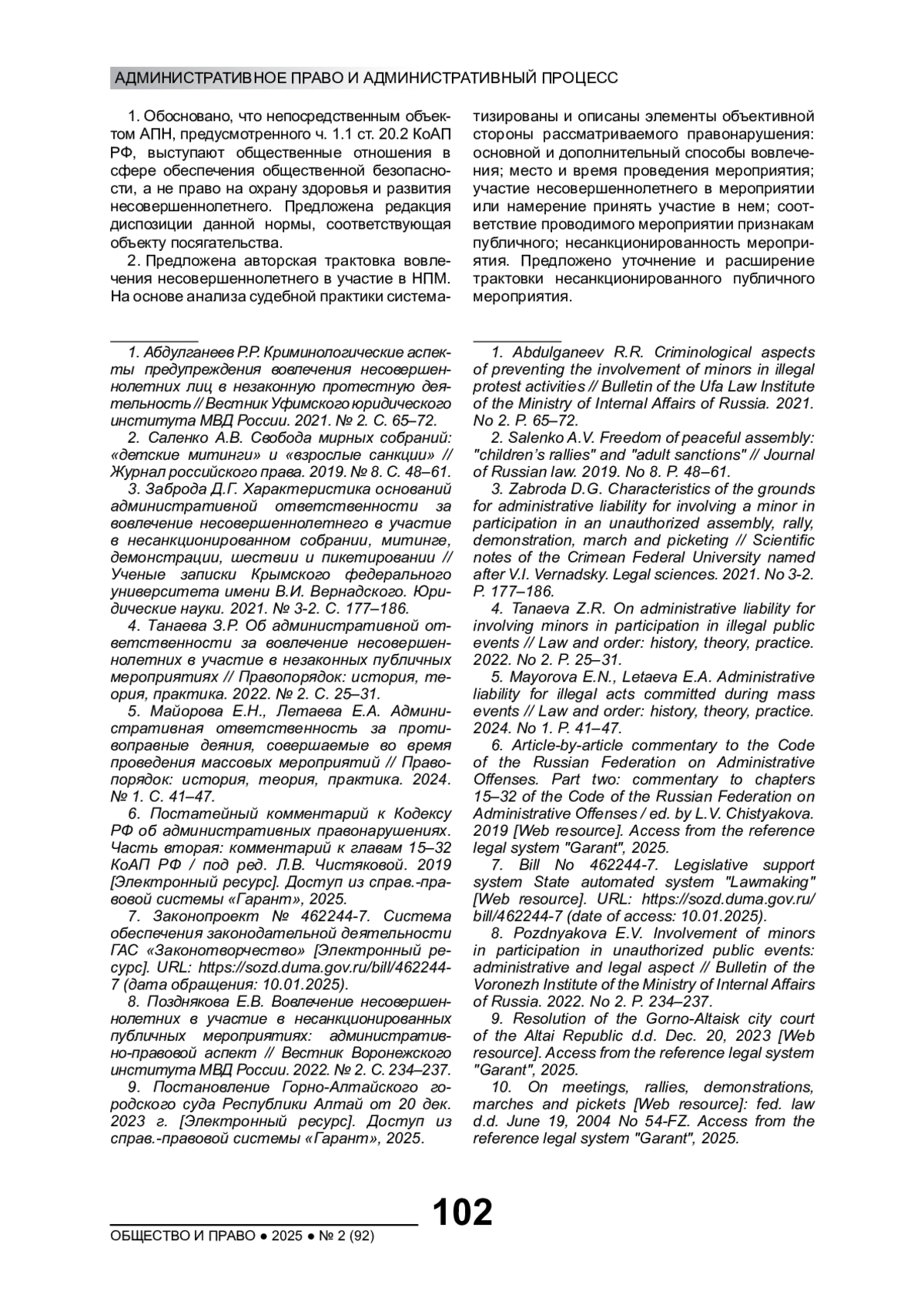 Статья: ВОВЛЕЧЕНИЕ НЕСОВЕРШЕННОЛЕТНИХ В УЧАСТИЕ В НЕСАНКЦИОНИРОВАННЫХ ПУБЛИЧНЫХ МЕРОПРИЯТИЯХ: ОБЪЕКТИВНЫЕ ПРИЗНАКИ (2025)
