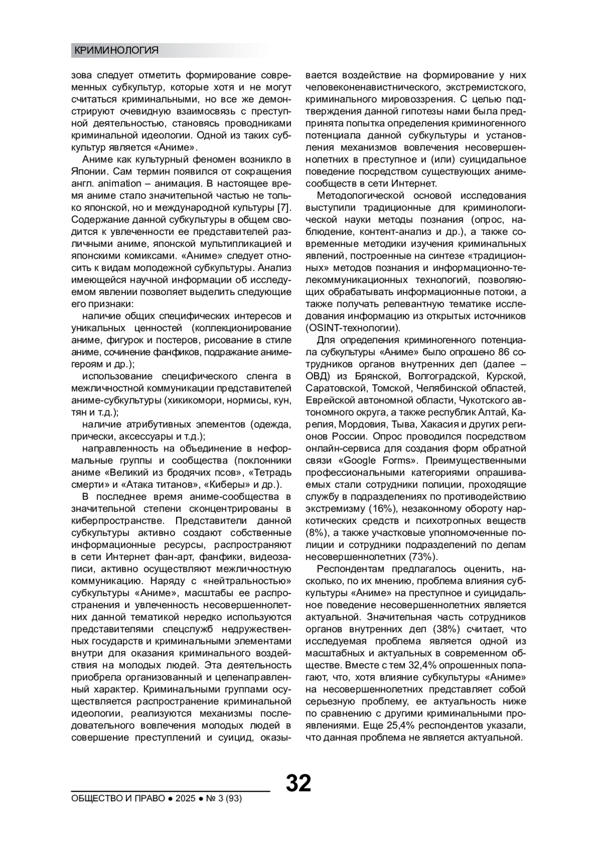 Определены понятие и признаки субкультуры «Аниме». Установлена активная интеграция отдельных аниме-сообществ в киберпространство, выявлен их криминогенный потенциал. Представлены основные направления деструктивной и криминальной активности аниме-сообществ в сети Интернет. Описан механизм вовлечения несовершеннолетних в преступное или суицидальное поведение (интеграция в нейтральные фандомы, селективное перенаправление в криминальные среды, формирование криминогенных и суицидогенных качеств личности пользователя), разработаны основные направления антикриминальной практики в этой сфере