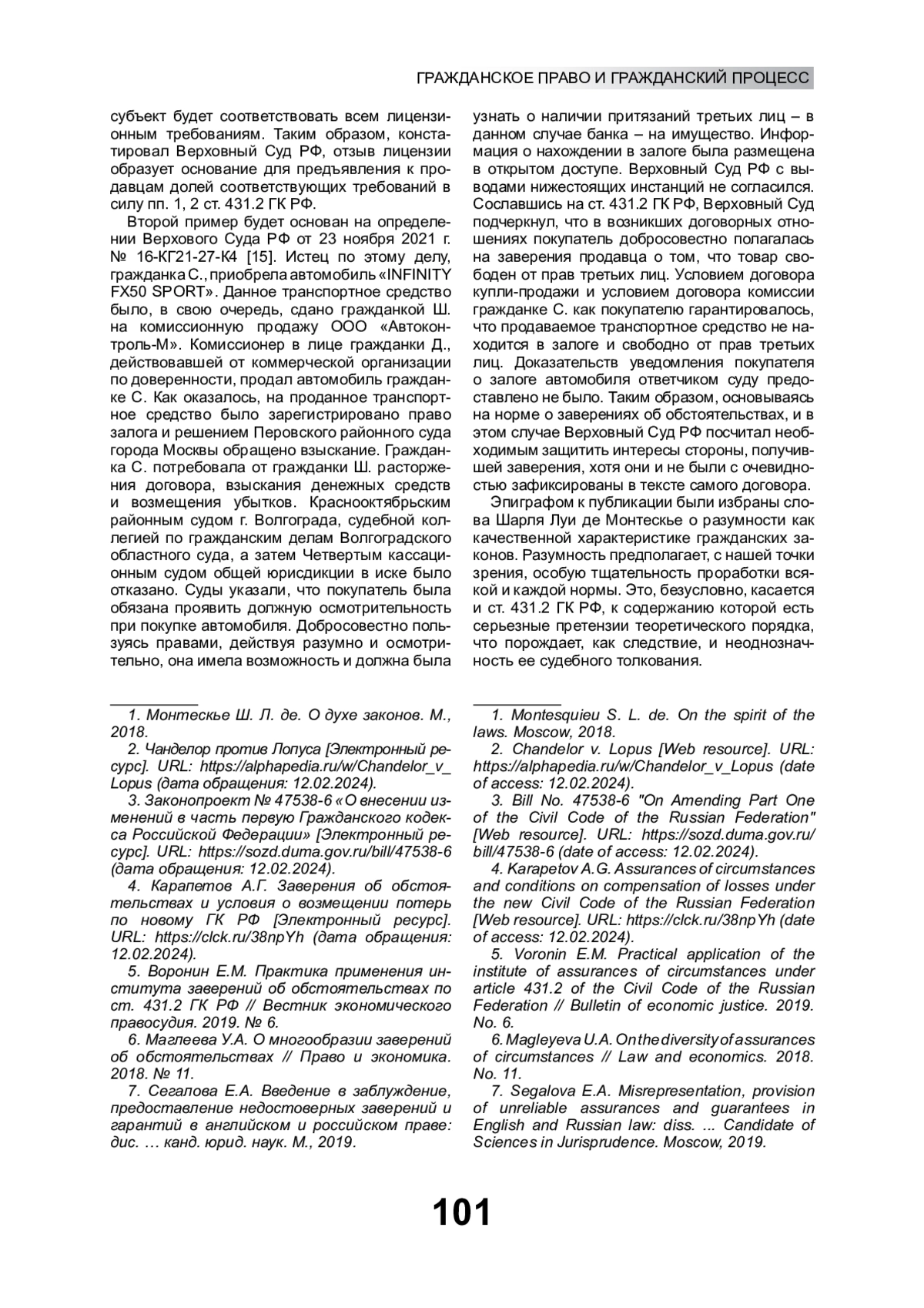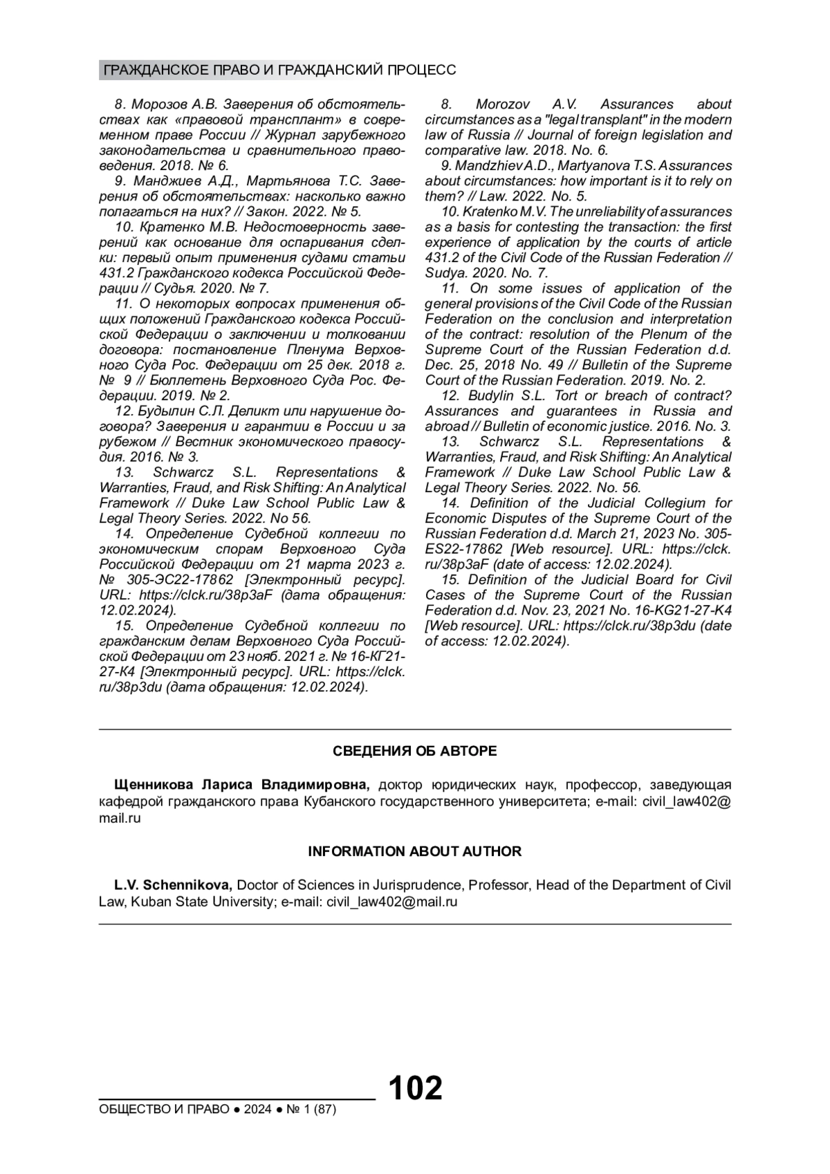 10. Кратенко М.В. Недостоверность заверений как основание для оспаривания сделки: первый опыт применения судами статьи 431.2 Гражданского кодекса Российской Федерации // Судья. 2020. № 7. EDN: EZGFFV
