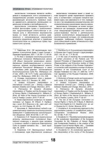 25. Ковлер А.И. Эволютивное толкование Европейской конвенции по правам человека: возможности и пределы. Европейский суд по правам человека как субъект толкования права // Журнал зарубежного законодательства и сравнительного правоведения. 2016. № 3. С. 92-100. EDN: WGERYV