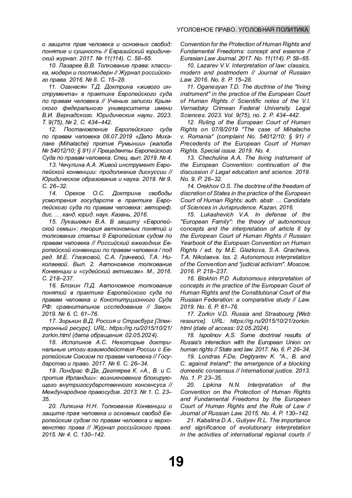 16. Блохин П.Д. Автономное толкование понятий в практике Европейского суда по правам человека и Конституционного Суда РФ: сравнительное исследование // Закон. 2019. № 6. С. 61-76. EDN: OCQZFS