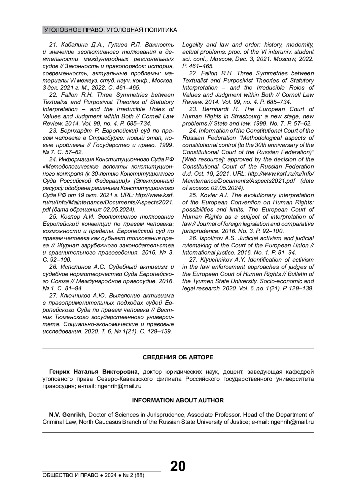 27. Ключников А.Ю. Выявление активизма в правоприменительных подходах судей Европейского Суда по правам человека // Вестник Тюменского государственного университета. Социально-экономические и правовые исследования. 2020. Т. 6, № 1(21). С. 129-139.