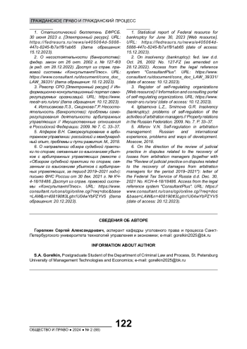 5. Алферов В.Н. Саморегулирование в арбитражном управлении: российский и международный опыт, проблемы и пути развития. М., 2018. EDN: EOSKKL