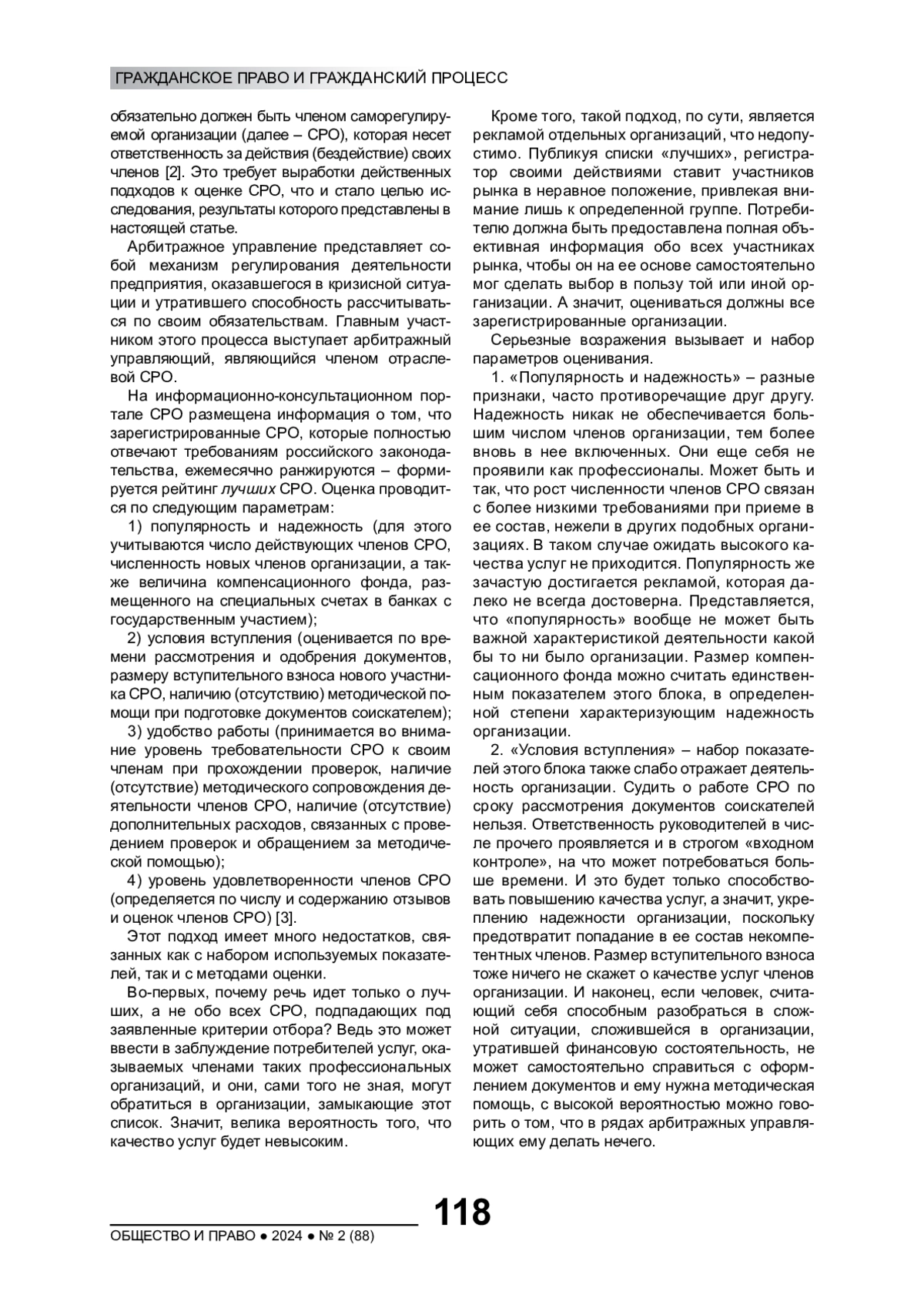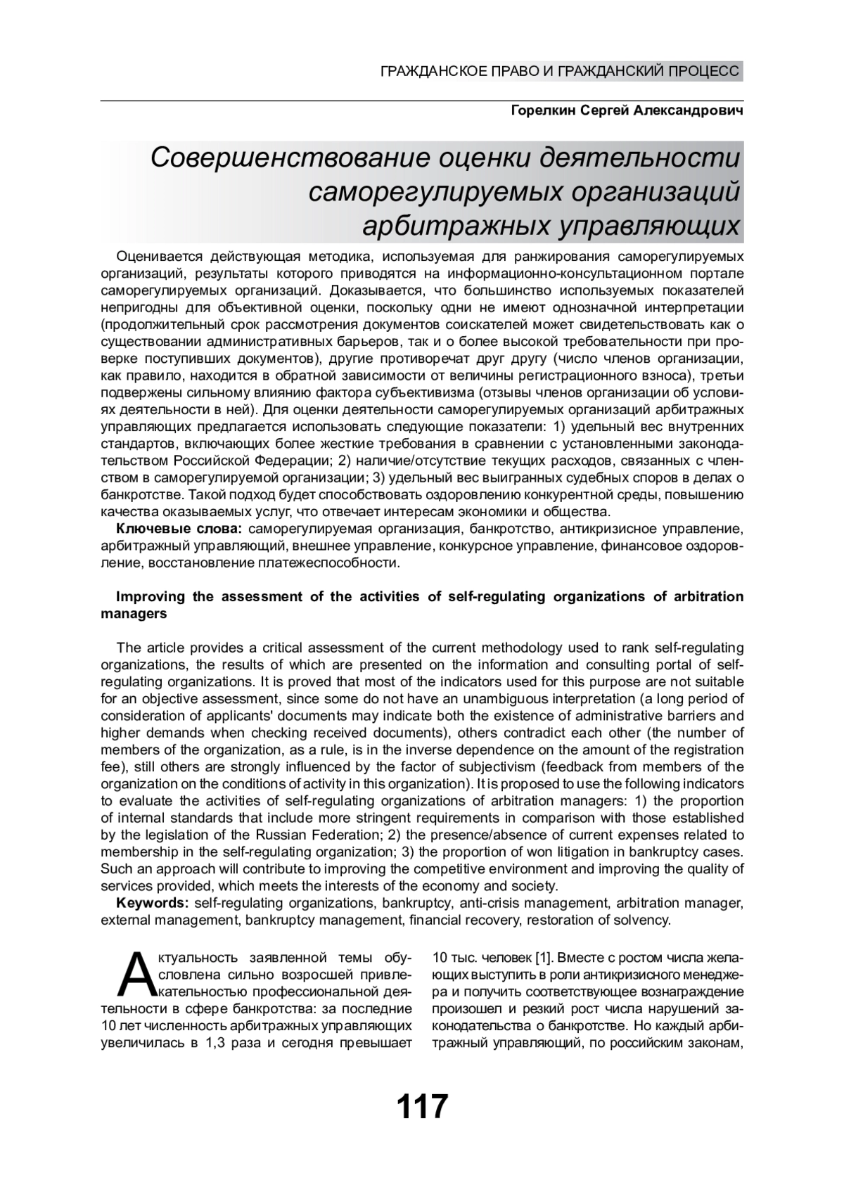 Оценивается действующая методика, используемая для ранжирования саморегулируемых организаций, результаты которого приводятся на информационно-консультационном портале саморегулируемых организаций. Доказывается, что большинство используемых показателей непригодны для объективной оценки, поскольку одни не имеют однозначной интерпретации (продолжительный срок рассмотрения документов соискателей может свидетельствовать как о существовании административных барьеров, так и о более высокой требовательности при проверке поступивших документов), другие противоречат друг другу (число членов организации, как правило, находится в обратной зависимости от величины регистрационного взноса), третьи подвержены сильному влиянию фактора субъективизма (отзывы членов организации об условиях деятельности в ней). Для оценки деятельности саморегулируемых организаций арбитражных управляющих предлагается использовать следующие показатели: 1) удельный вес внутренних стандартов, включающих более жесткие требования в сравнении с установленными законодательством Российской Федерации; 2) наличие/отсутствие текущих расходов, связанных с членством в саморегулируемой организации; 3) удельный вес выигранных судебных споров в делах о банкротстве. Такой подход будет способствовать оздоровлению конкурентной среды, повышению качества оказываемых услуг, что отвечает интересам экономики и общества