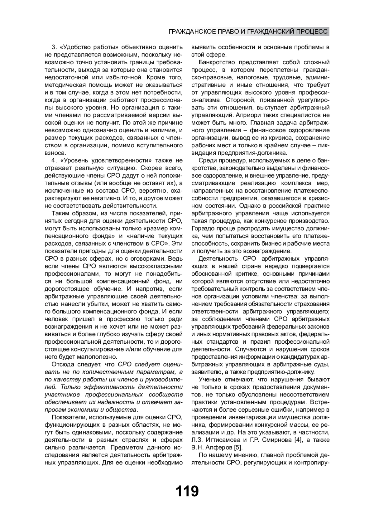 4. Игтисамова Л.З., Смирнова Г.Р. Несостоятельность (банкротство): проблемы саморегулирования деятельности арбитражных управляющих // Имущественные отношения в Российской Федерации. 2009. № 7. С. 33-37. EDN: KNVMUX
