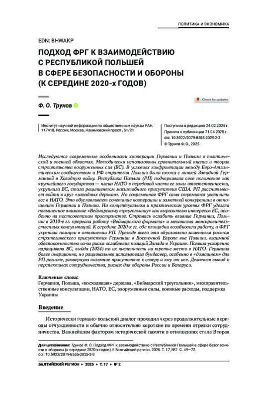 10.Трунов, Ф. О. 2019, Германо-польские отношения на современном этапе: Политико-военное измерение, Актуальные проблемы Европы, № 3, с. 169—190. EDN: JKBWSP, https://doi.org/10.31249/ape/2019.03.08