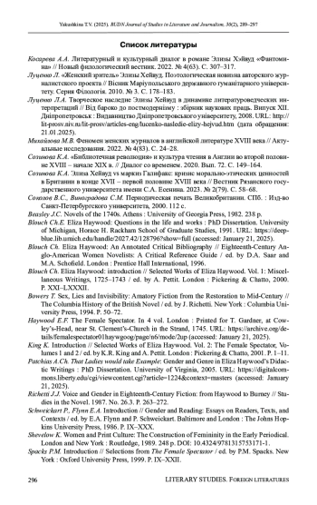 21. Spedding P. Eliza Haywood’s Eighteenth-Century Readers in Pennsylvania and New York // Australian Humanities Review. 2014. No. 56. P. 69-93.